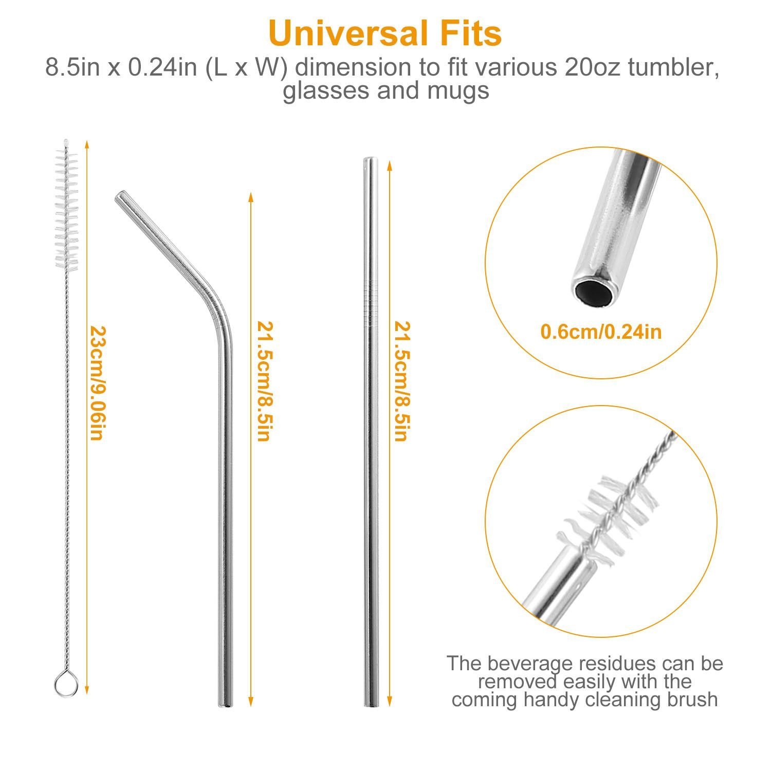 *Universal Fits*:Owning an 8.5in x .24in(L x W) dimension to fit most daily drinking-various fruit and vegetable juice; milk; tea; coffee; milkshake; sorbet; beer; water; etc.-in approx. 20oz tumbler; glasses and mugs.
