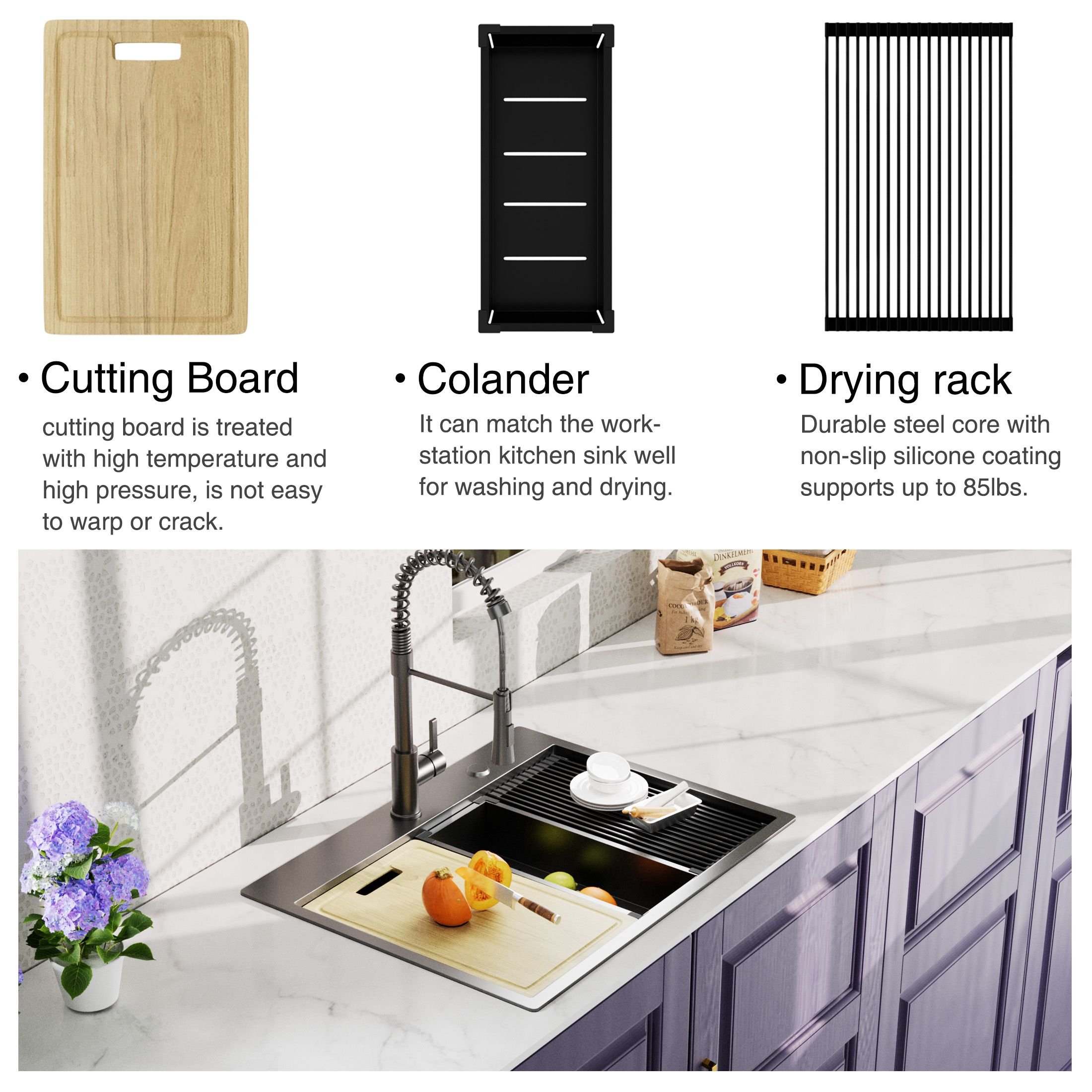 Purchase includes kitchen sink, chrome bottom grid, strainer drain, bamboo cutting board, deep stainless steel colander, roll-up rack drying rack, towel, faucet and topmount clips