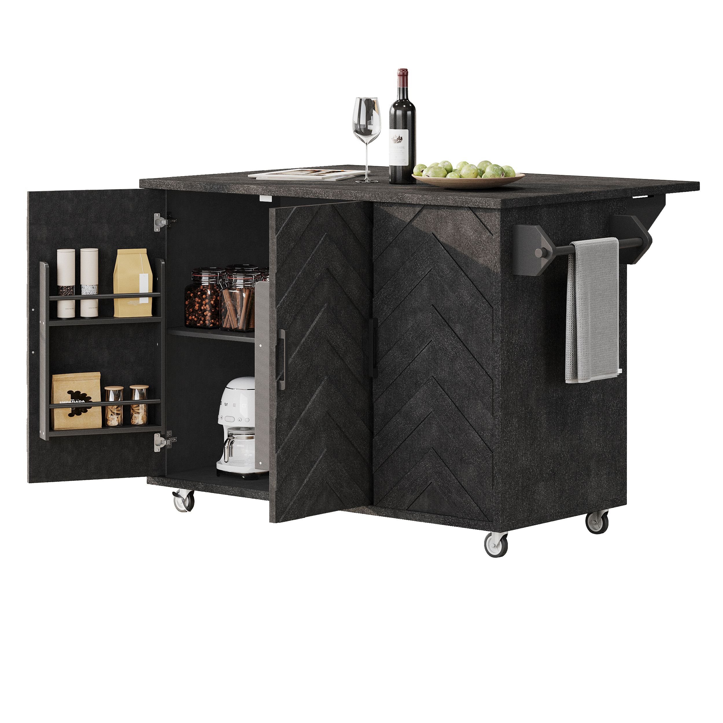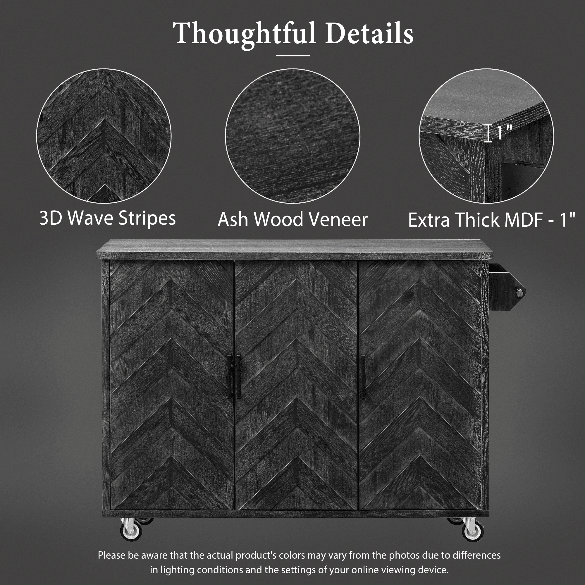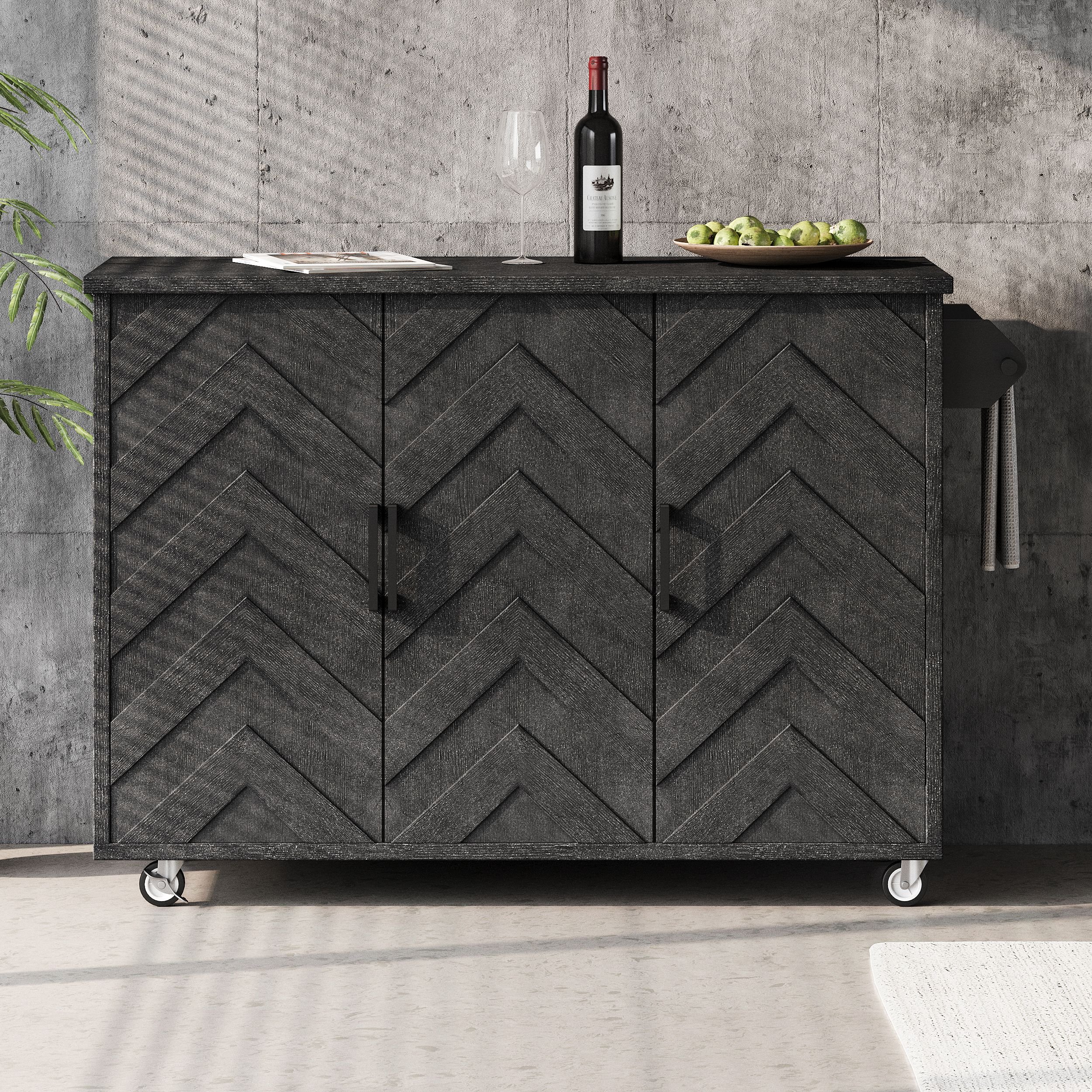 The kitchen island fuses farmhouse style, high-end details, and versatile storage. Crafted from CARB Phase II certified MDF boards + ash veneer, its 47"-wide countertop features a smooth, scratch-proof ash veneer finish table that's great for food prep. This Three-doors cabinet combines retro colors and unique 3D Wave Stripes details that instantly upgrade any space. Whether you're furnishing your Kitchen, Dining Room, or home corridor, you'll love how this leisurely island provides ample storage space for your household needs with an internal storage rack and adjustable shelves. Our kitchen island on wheels is designed with 4 x 360-degree wheels, including two locking wheels to meet your desire to move everywhere smoothly and stabilize.