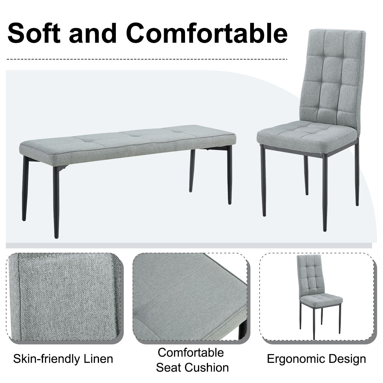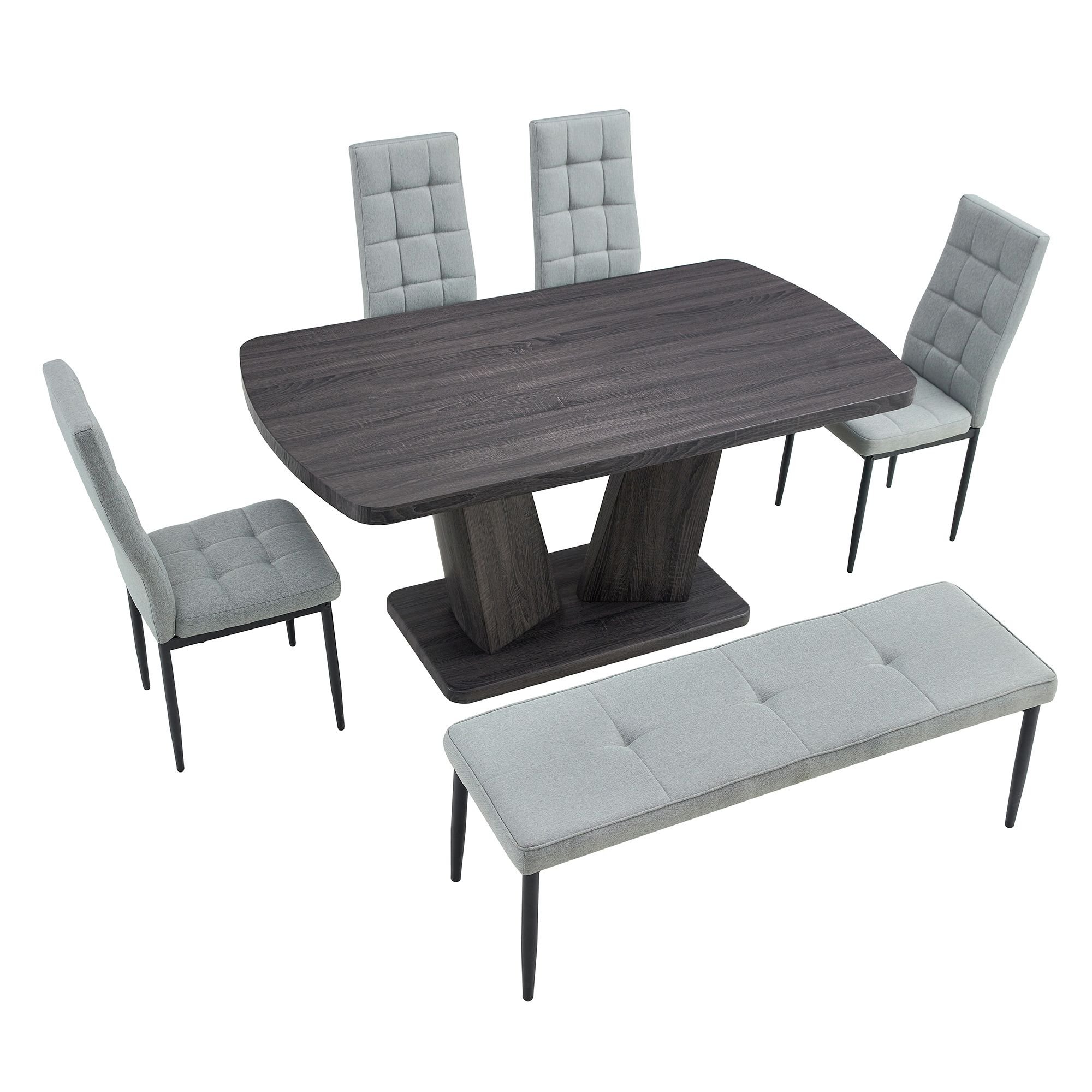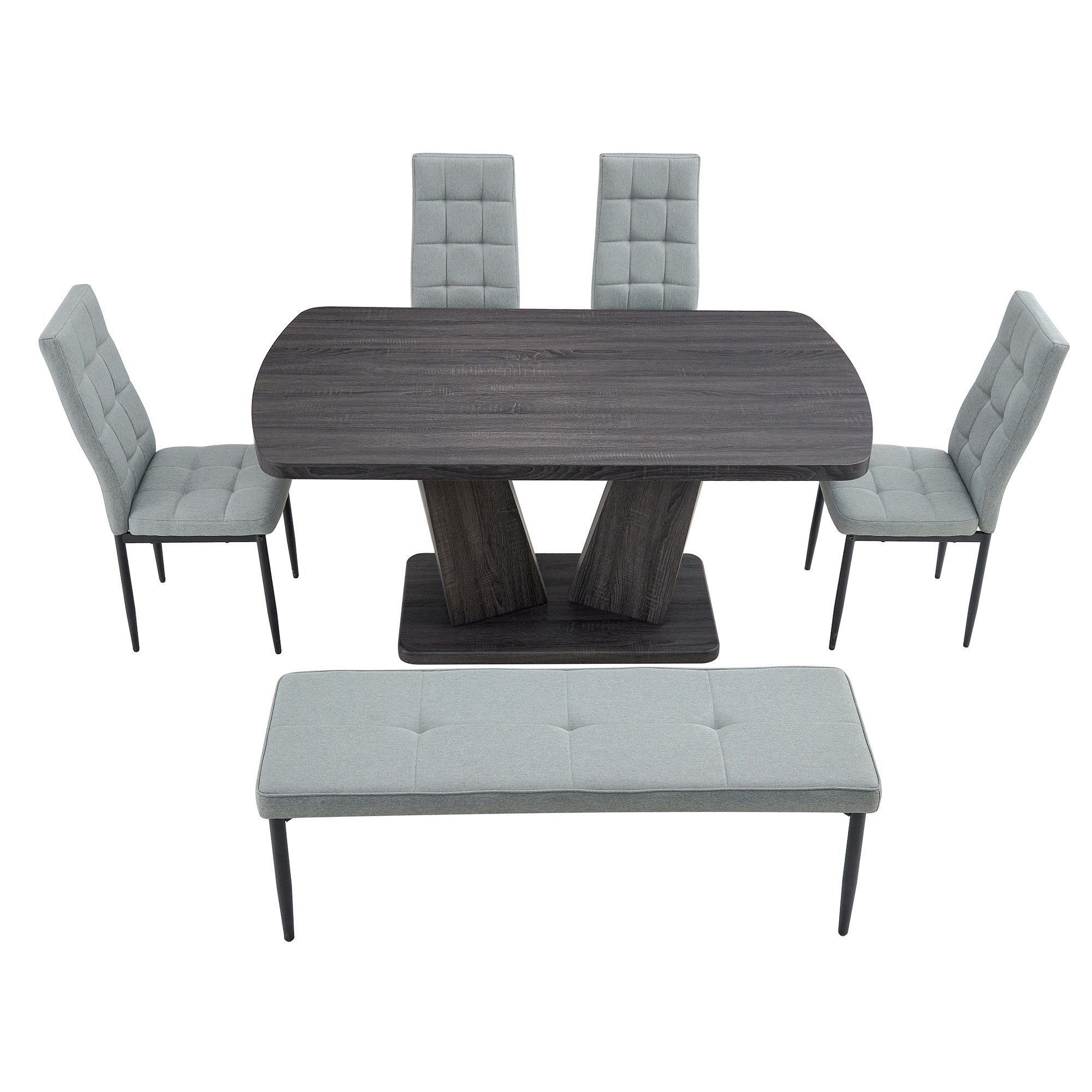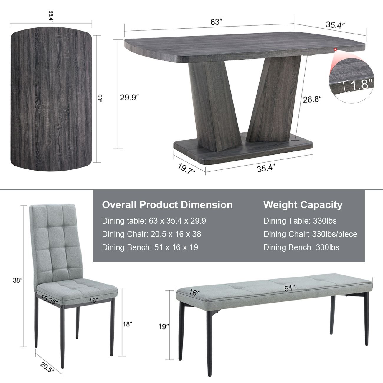 The kitchen table set has one table, 4 chairs, and a long bench for 6 people. Dining Table:63" L x 35.4" W x 29.9" H. The dining table's V-shaped leg support foundation will not hinder dinners, offering ample space for leg motions and gestures.