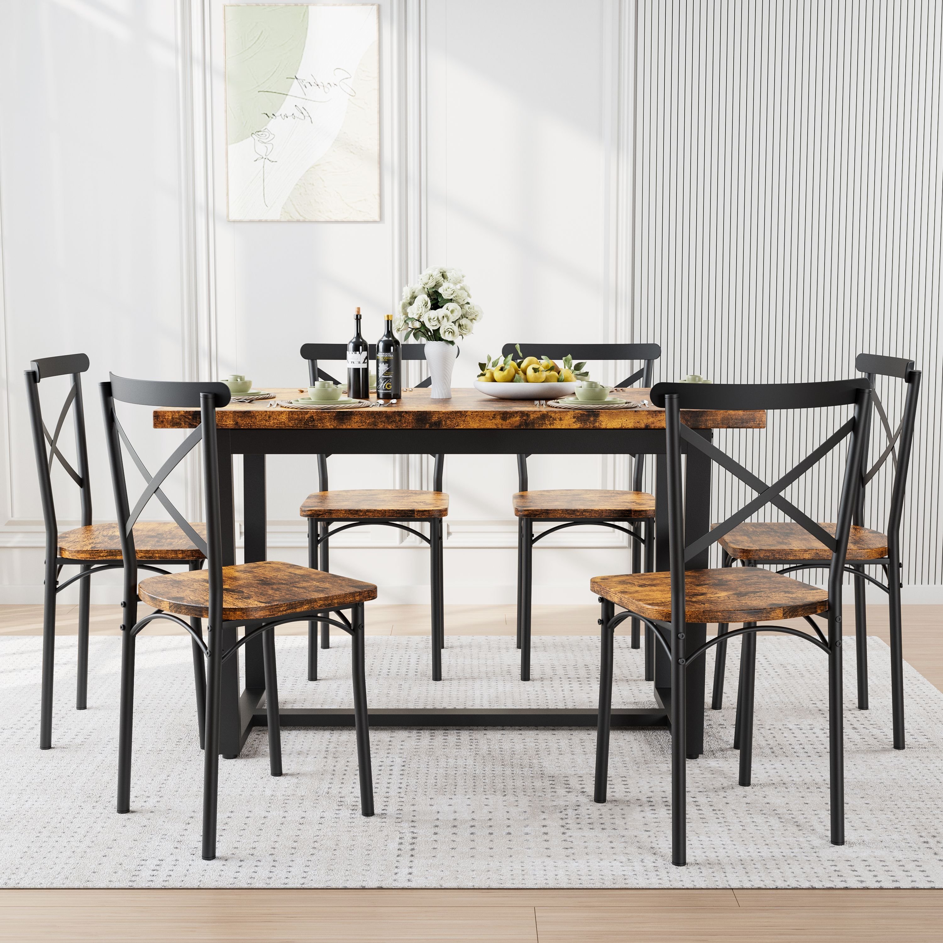 7 Pieces Dining Set: This dining set includes a table and four matching chairs for the whole family to enjoy. The table and chair legs are fitted with base plastic protective foot pads that can protect your floor from scratches while ensuring the table and chairs maintain their stability.