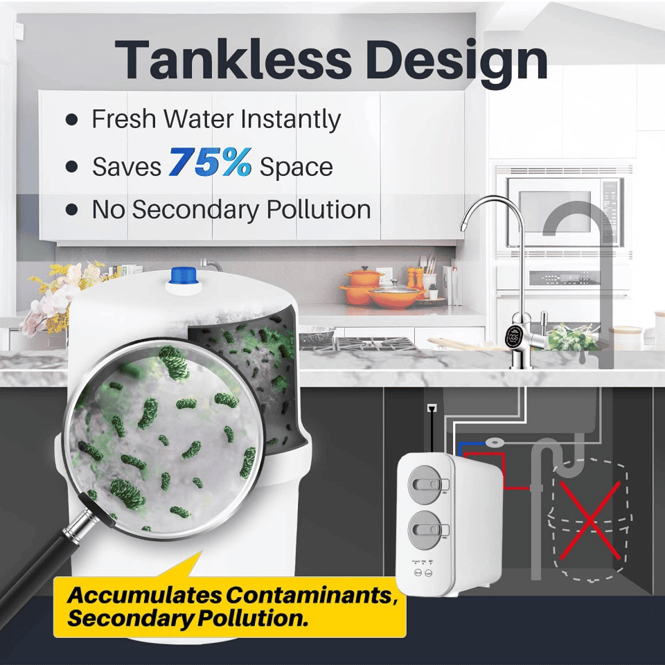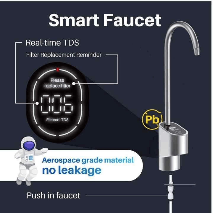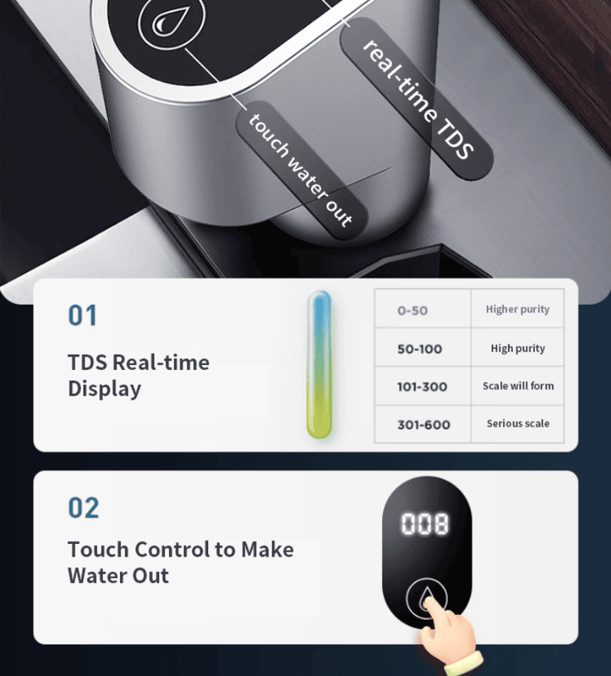 5.Reverse osmosis system tankless comes with TDS detection,the display panel tells Real-Time OUT TDS after filtration,constantly monitors the quality of your drinking water.(TDS stands for Total Dissolved Solids and represents the total concentration of dissolved substances in water. )