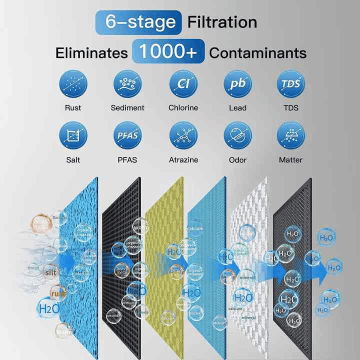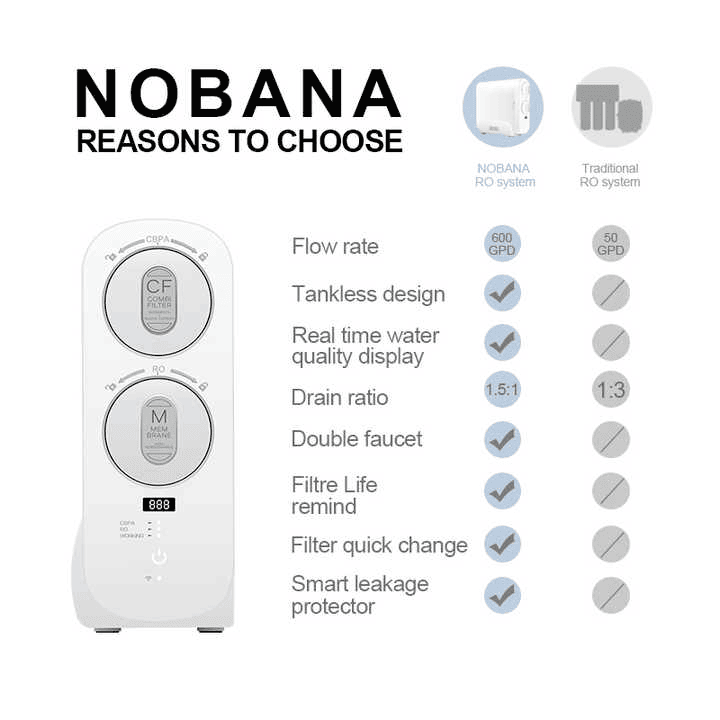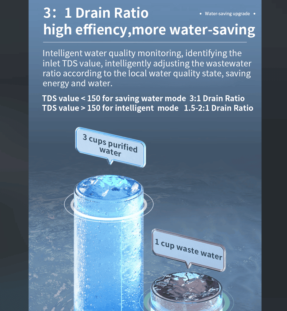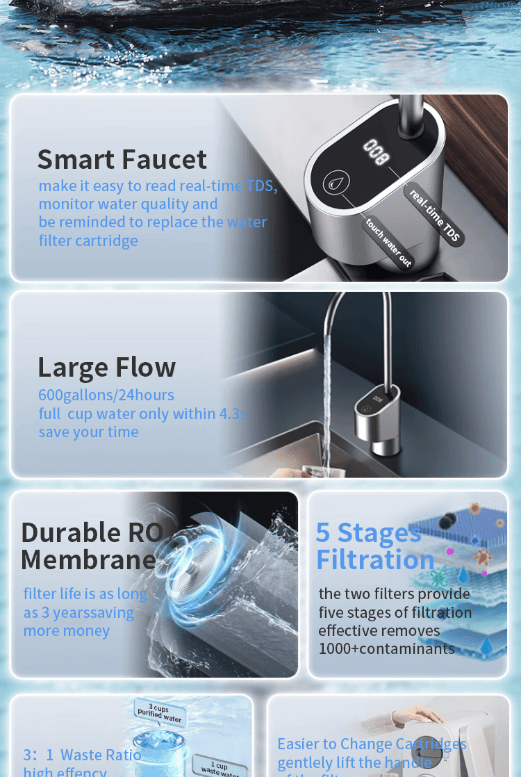 2.Our RO system offers a fast water flow rate of up to 600 GPD (gallons per day),Meet your daily drinking water and party needs . Unlike slow, traditional RO systems, our fast filtering technology ensures a continuous water supply and a fast flow, while reducing water waste by 34%.