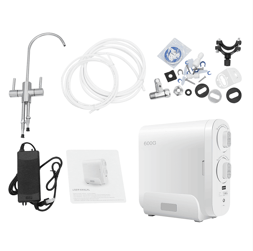 1 * RO system (with filter), 2 * filter element, 1 * Faucet, 1 * power supply, 2 * polyethylene pipe, 1 * accessory kit, 1 * English instruction manual
