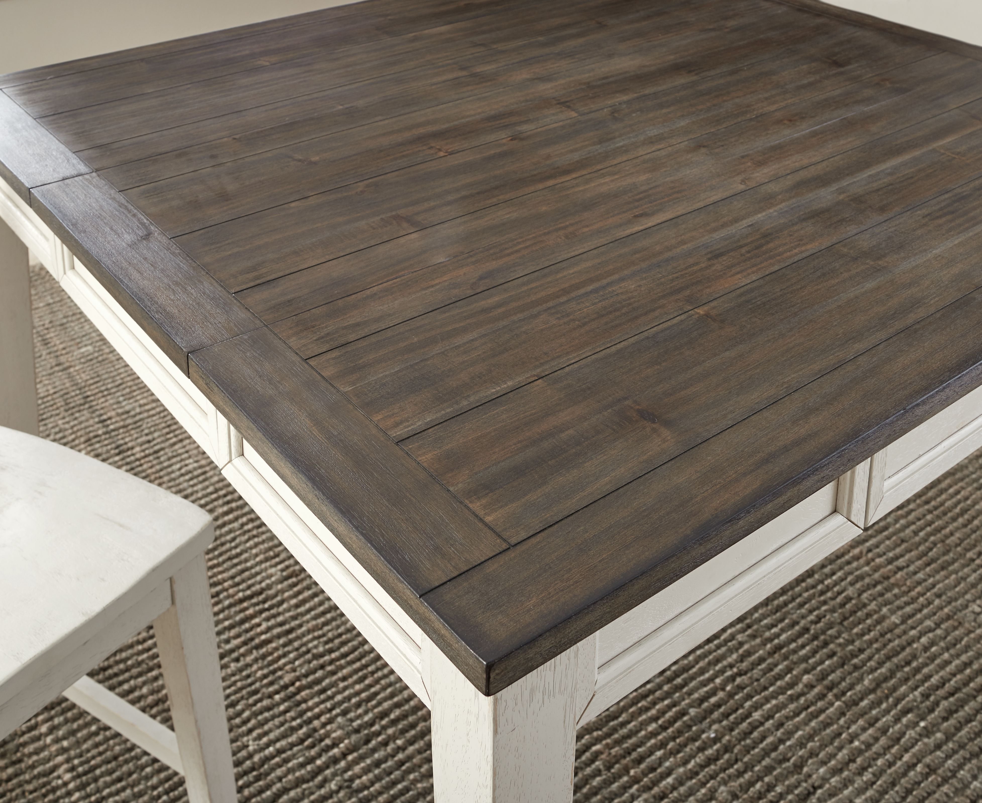Modern farmhouse styling constructed of hardwood solids with acacia veneers in a two-tone finish of antiqued white and dark oak
