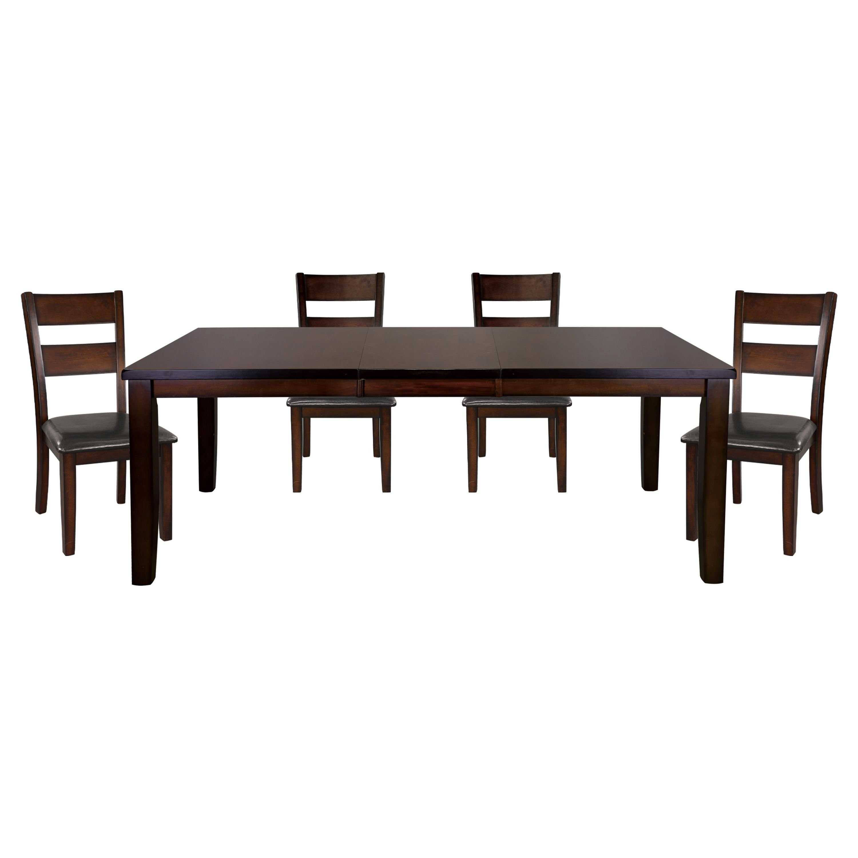 Transitionally styled for your home is the Mantello Collection. Offered in traditional dining height, the collections cherry finish over mango veneer and classic styling will provide the perfect platform for your mealtime gatherings. Dark brown faux leather covers the available side chairs.PRODUCT DIMENSIONS: -Dining Table: 42" x 60" - 78" x 30"HApron to floor: 25.75"Distance between legs from the shorter side: 34.75"Distance between legs from the longer side: 70.75"Length of leaf: 18" x 1Side Chairs: 19" x 23" x 38.5"HSeat Width: 19"Seat Depth: 17.5"Seat Height: 19"Listing Includes: - 5pc Dining Set ( 1 Dining table and 4 Side Chairs) Only.Server: Not included.Simple Assembly Require.