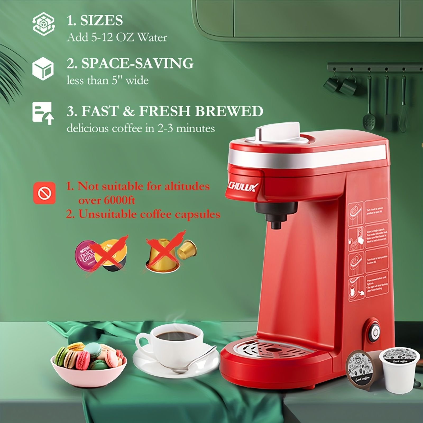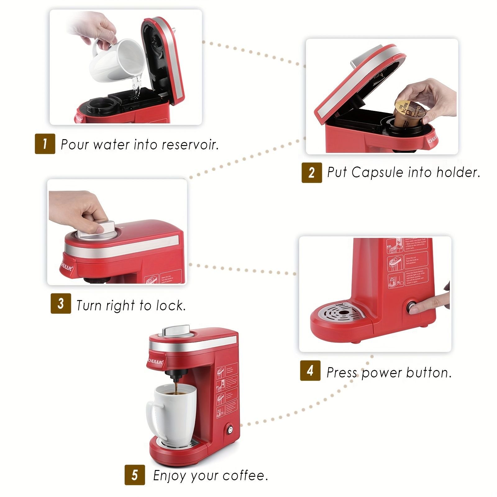 1, (SINGLE CUP COFFEE BREWER-12OZ)CHULUX individual coffee maker fits 1.0 and 2.0 pod coffee capsules to meet your multi favour.You also can use ground coffee (reusable filter NOT included) to create your private cafe at leisure or busy moment.