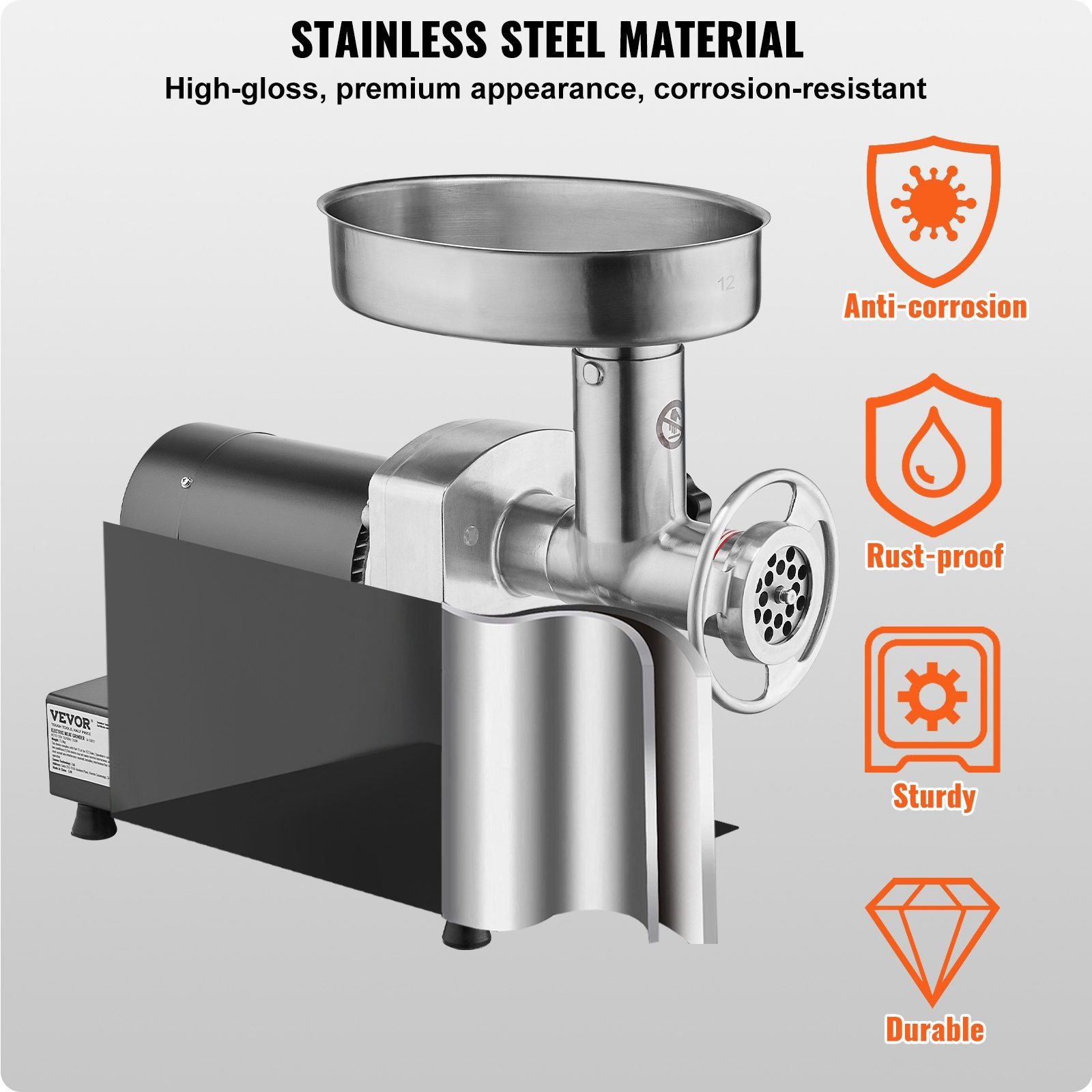 The commercial countertop meat grinder, mouth size 12#, features a highly efficient 550W pure copper motor capable of grinding 9 lbs of meat per minute. Made of stainless steel, it's sturdy and durable. The SUS420 blade that can grind various types of meat, making it ideal for commercial use.