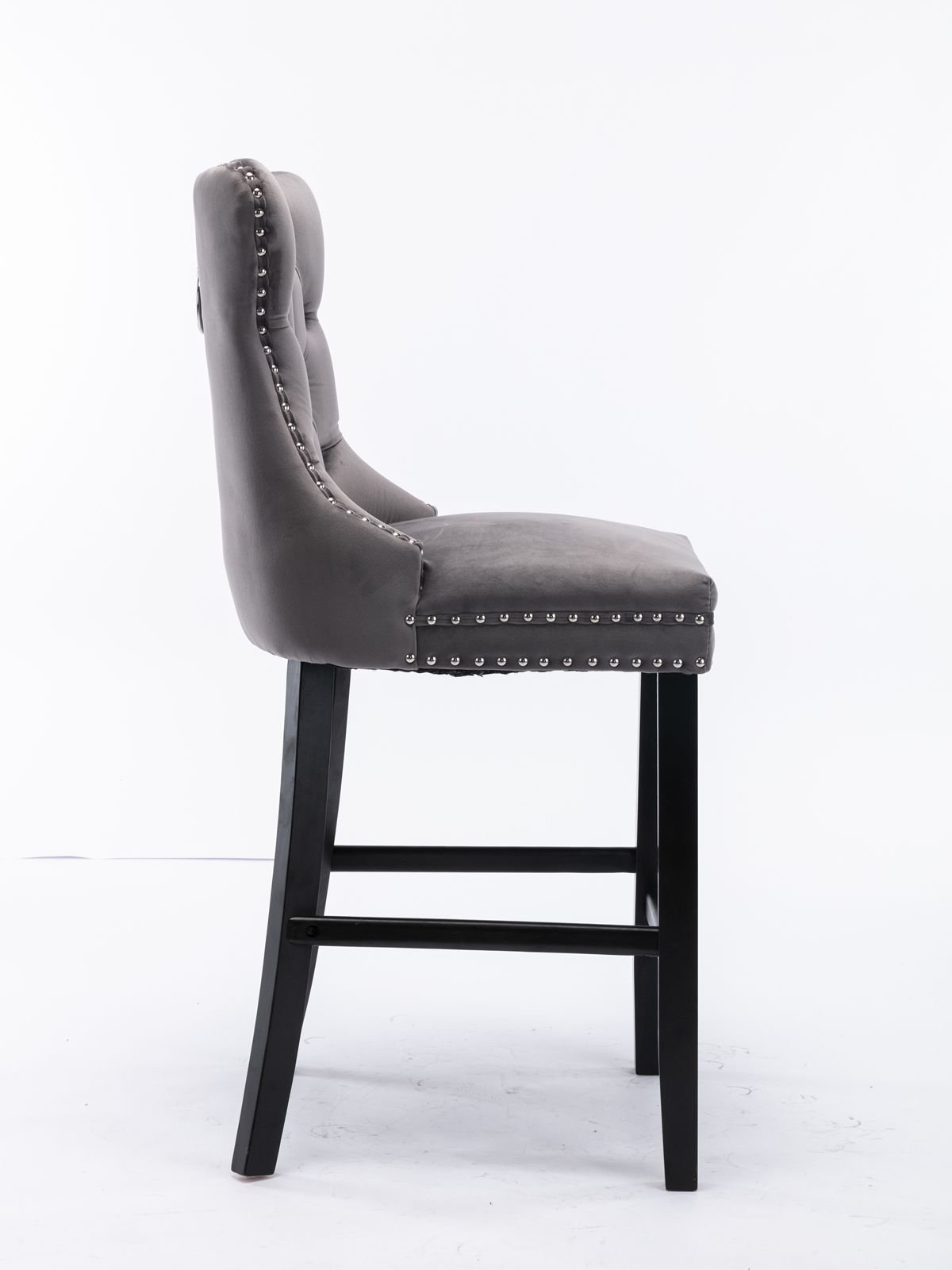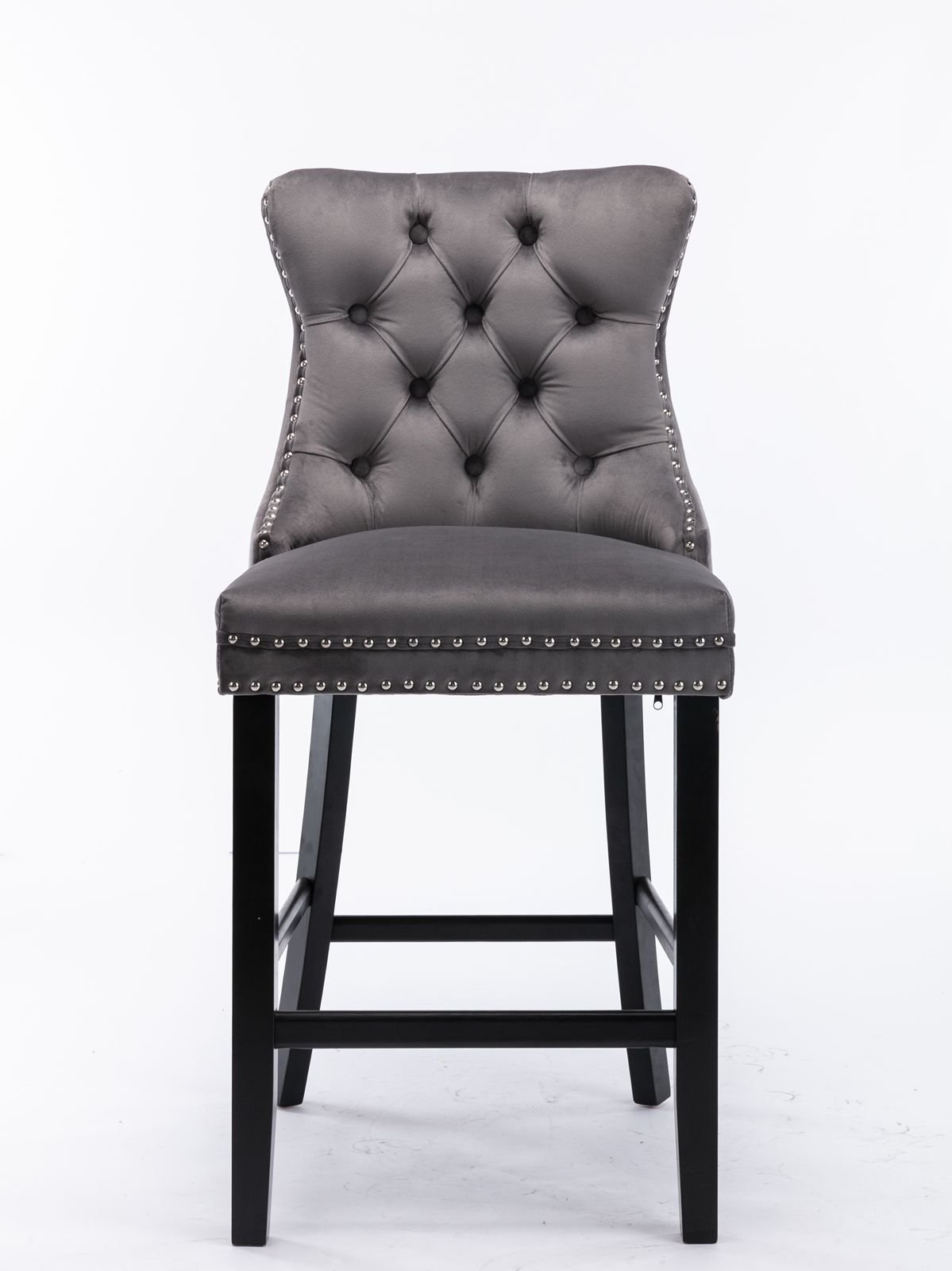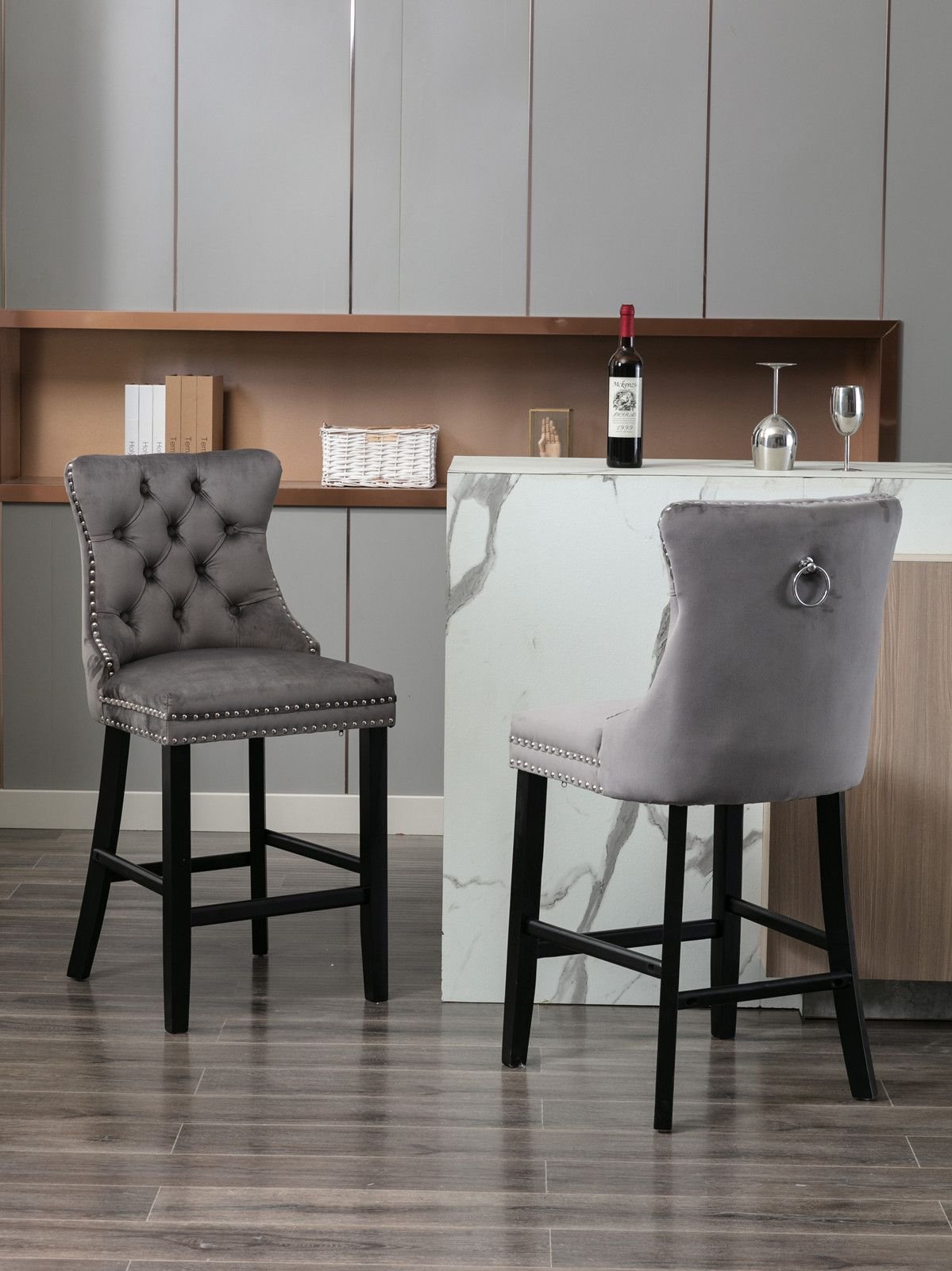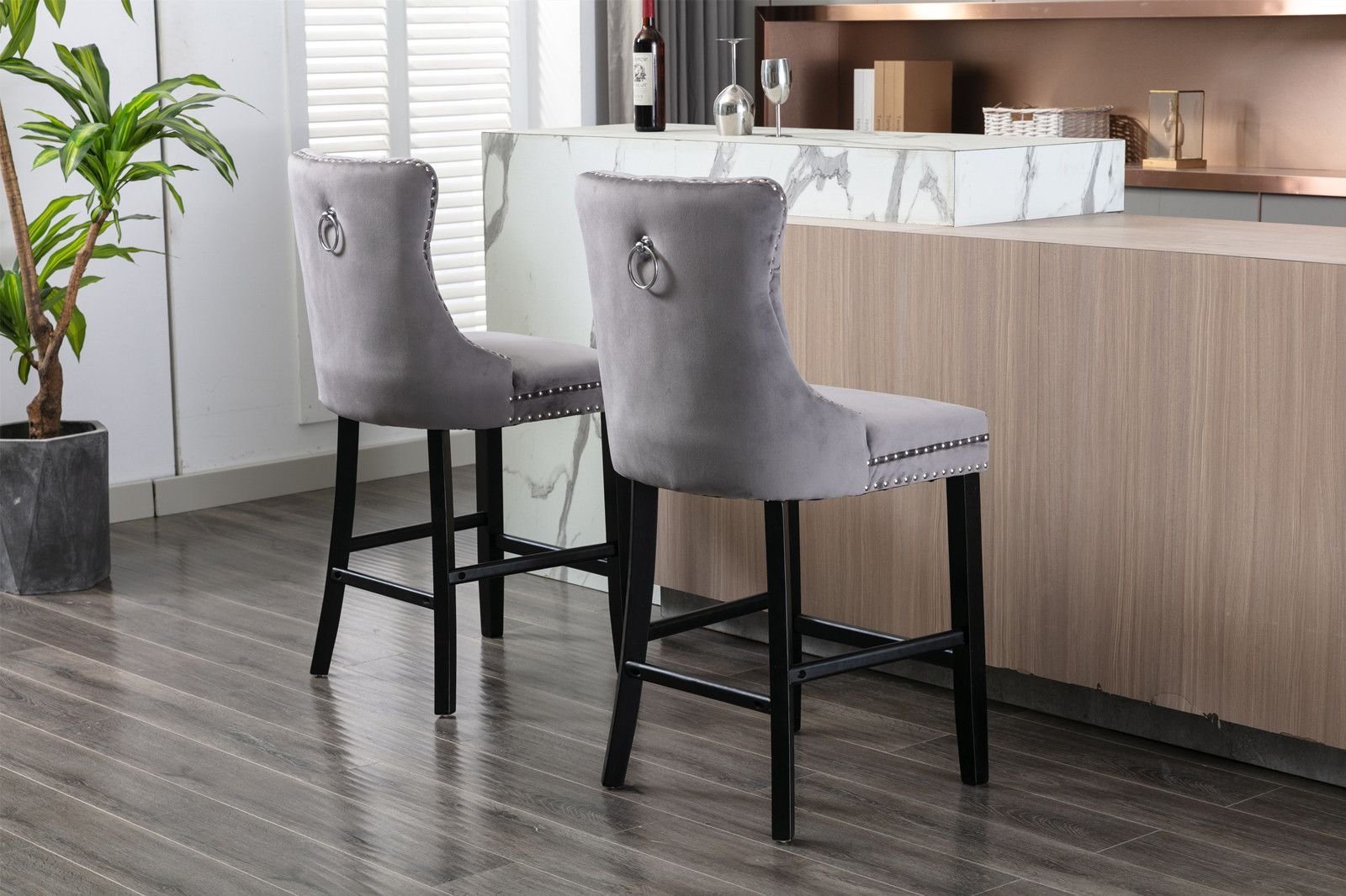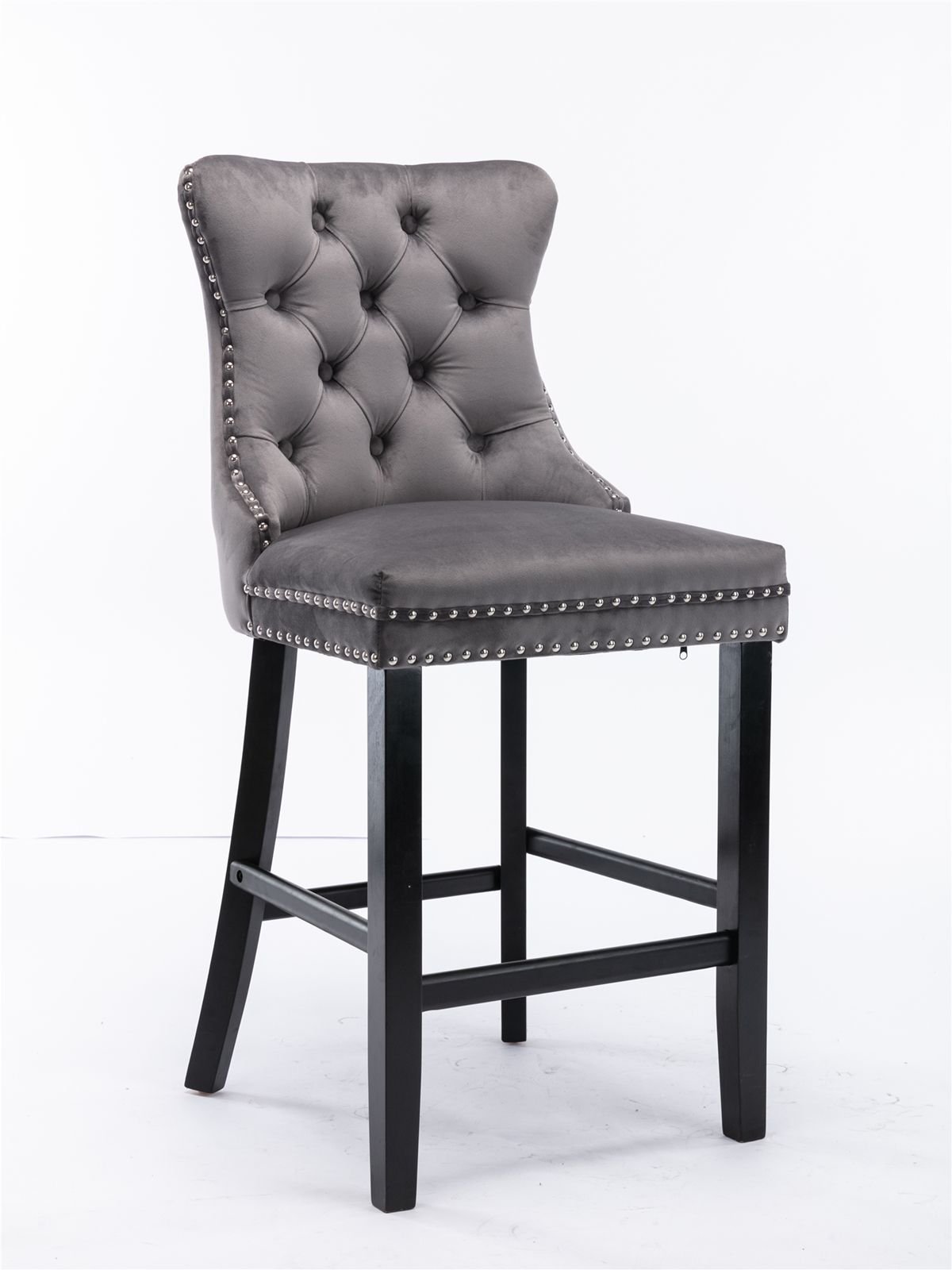 Contemporary Velvet Upholstered Barstools with Button Tufted Decoration and Wooden Legs, and Chrome Nailhead Trim, Leisure Style Bar Chairs,Bar stools