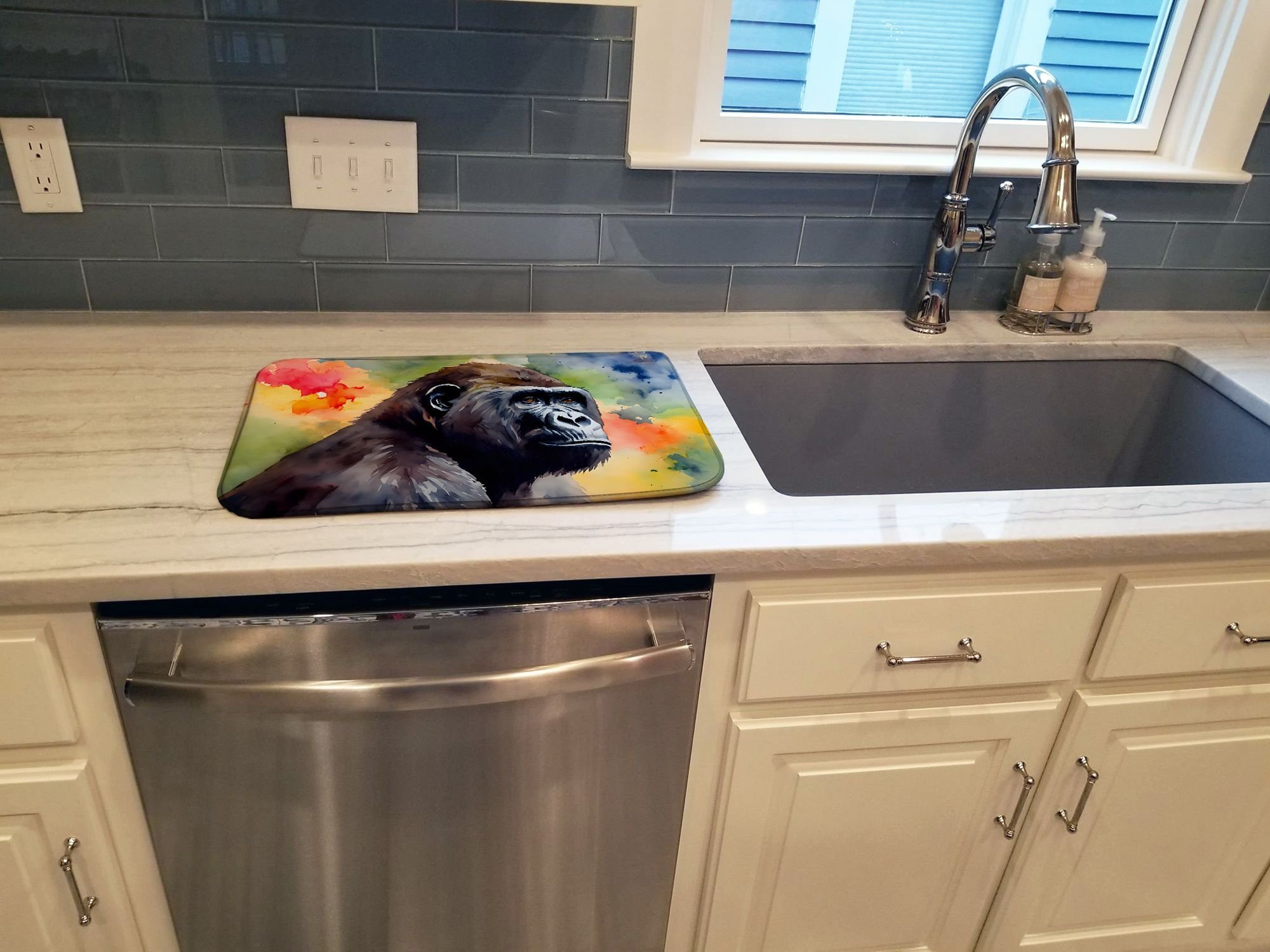 Dish Drying Mat featuring breed specific Gorilla artwork. Say goodbye to messy countertops and soggy dish towels with our innovative dish drying mat. Our high-quality dish drying pad is designed to keep your countertops dry while offering a stylish and efficient solution. Whether you're air drying dishes, glasses, stemware, silverware, pots, pans, bottles, or even fruits and vegetables, our dish mat is the perfect choice. The 14 inches x 22 inches size fits most counters and dish drying racks, and the non-slip design ensures stability. Made with water-absorbent polyester and a polyurethane foam insert, our dish drying mat is not only functional but also durable. It's machine washable and printed in the USA for long-lasting use. The beautiful artwork adds flair to your kitchen decor, making it a perfect housewarming gift or present for any occasion. Upgrade your kitchen experience with our absorbent and versatile dish drying mat.