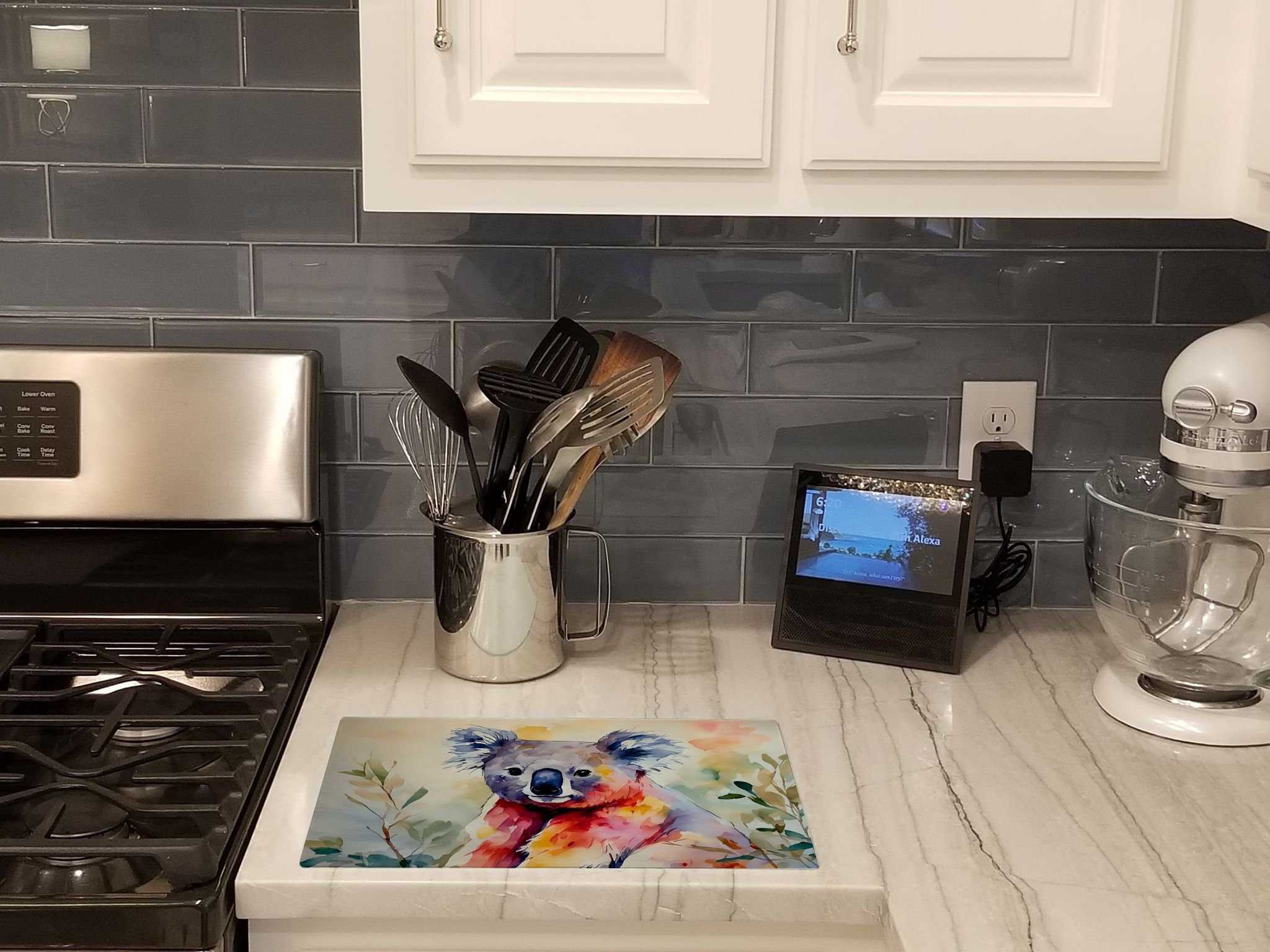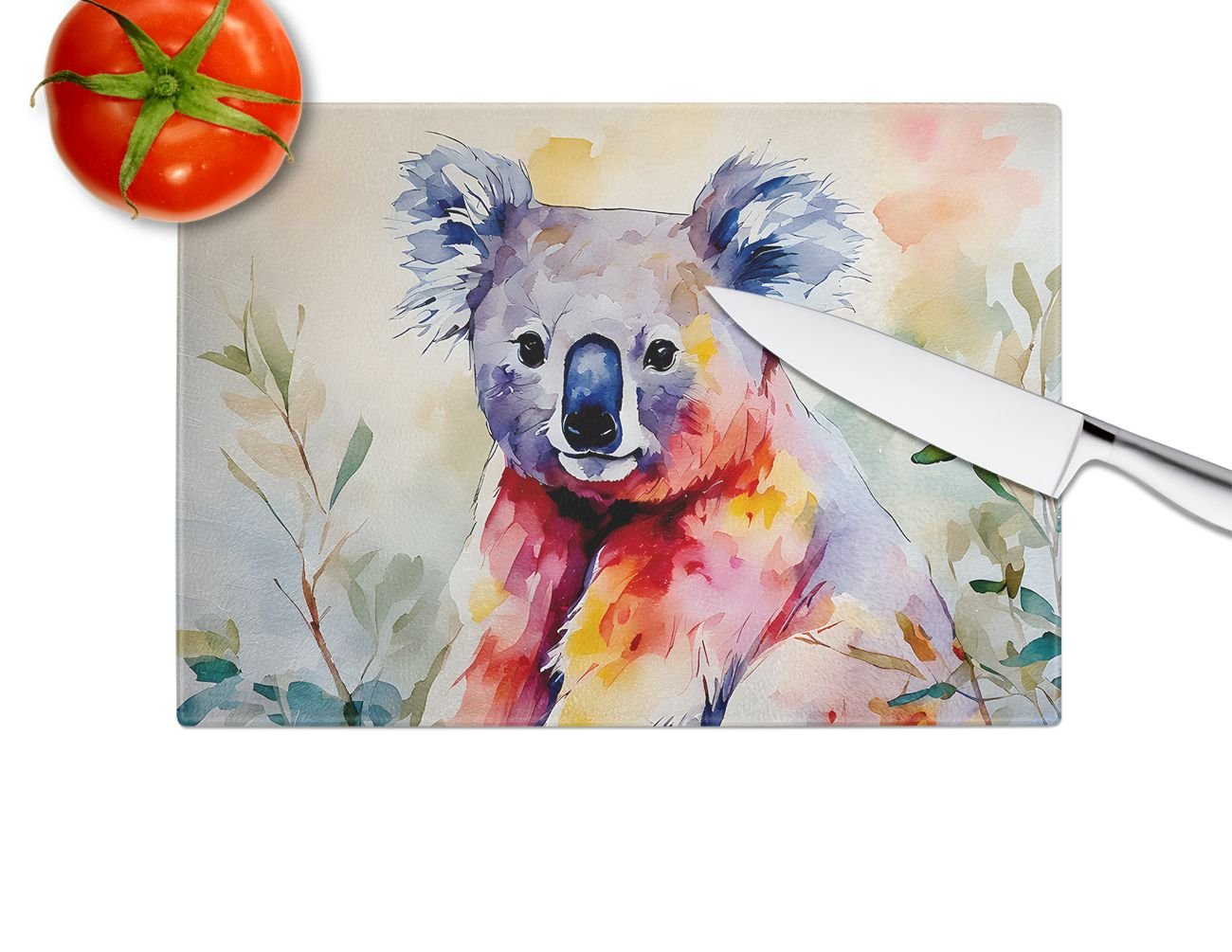 Glass Cutting Board featuring breed specific Koala artwork. Introduce your kitchen to the vibrant, large Decorative Glass Cutting Board from Caroline's Treasures. Crafted from resilient tempered glass, this board is not only a utilitarian necessity but also a colorful art piece. With its generous dimensions of 15 inches in height and 12 inches in length, it offers ample space for all your cutting needs. Every piece showcases captivating artwork from distinguished artists, bringing an aesthetic edge to your kitchen. Beyond its attractive design, this cutting board ensures your countertop stays pristine and unscathed, owing to its heat-resistant properties. Engineered with user convenience in mind, it features non-skid feet for stability, and rounded corners for additional safety. Its robust construction renders it virtually unbreakable, guaranteeing longevity. The board comes with protective feet bumpers, maintaining its position during use. This product is recommended to be hand washed only. Proudly printed and assembled in the United States, this cutting board exemplifies superior craftsmanship. With Caroline's Treasures' Decorative Glass Cutting Board, you're investing in a blend of functionality and artistic flair.