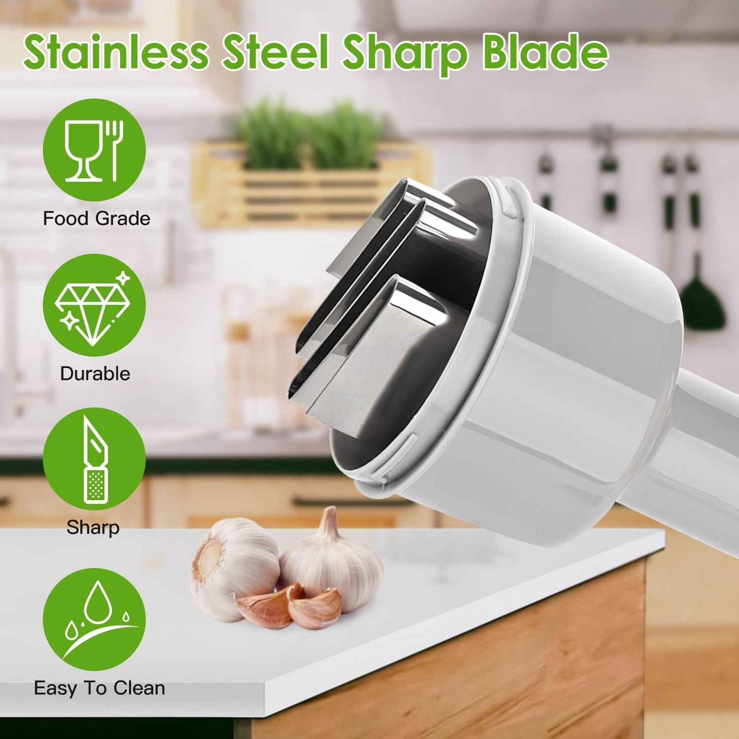 *Easy To Use*:Simply put the food into the container and hit/slap the top part several times to use. The inner stainless-steel blade will turn 24-degree per chop to help you get faster chopping,mincing dicing and grinding than a knife. The more you hit,the finer the food will be. Note:You may need to divide the food into smaller portions before chopping,like cut an onion into quarters before chopping.