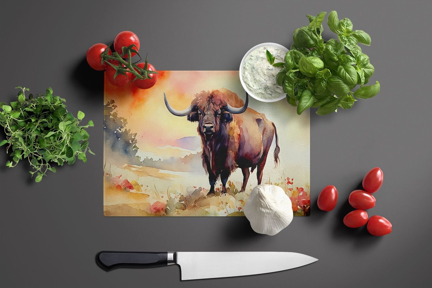 Glass Cutting Board featuring breed specific Buffalo artwork. Introduce your kitchen to the vibrant, large Decorative Glass Cutting Board from Caroline's Treasures. Crafted from resilient tempered glass, this board is not only a utilitarian necessity but also a colorful art piece. With its generous dimensions of 15 inches in height and 12 inches in length, it offers ample space for all your cutting needs. Every piece showcases captivating artwork from distinguished artists, bringing an aesthetic edge to your kitchen. Beyond its attractive design, this cutting board ensures your countertop stays pristine and unscathed, owing to its heat-resistant properties. Engineered with user convenience in mind, it features non-skid feet for stability, and rounded corners for additional safety. Its robust construction renders it virtually unbreakable, guaranteeing longevity. The board comes with protective feet bumpers, maintaining its position during use. This product is recommended to be hand washed only. Proudly printed and assembled in the United States, this cutting board exemplifies superior craftsmanship. With Caroline's Treasures' Decorative Glass Cutting Board, you're investing in a blend of functionality and artistic flair.