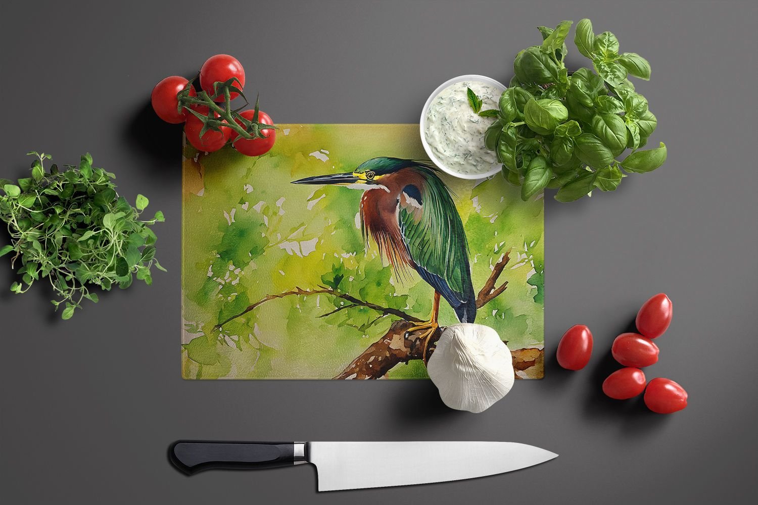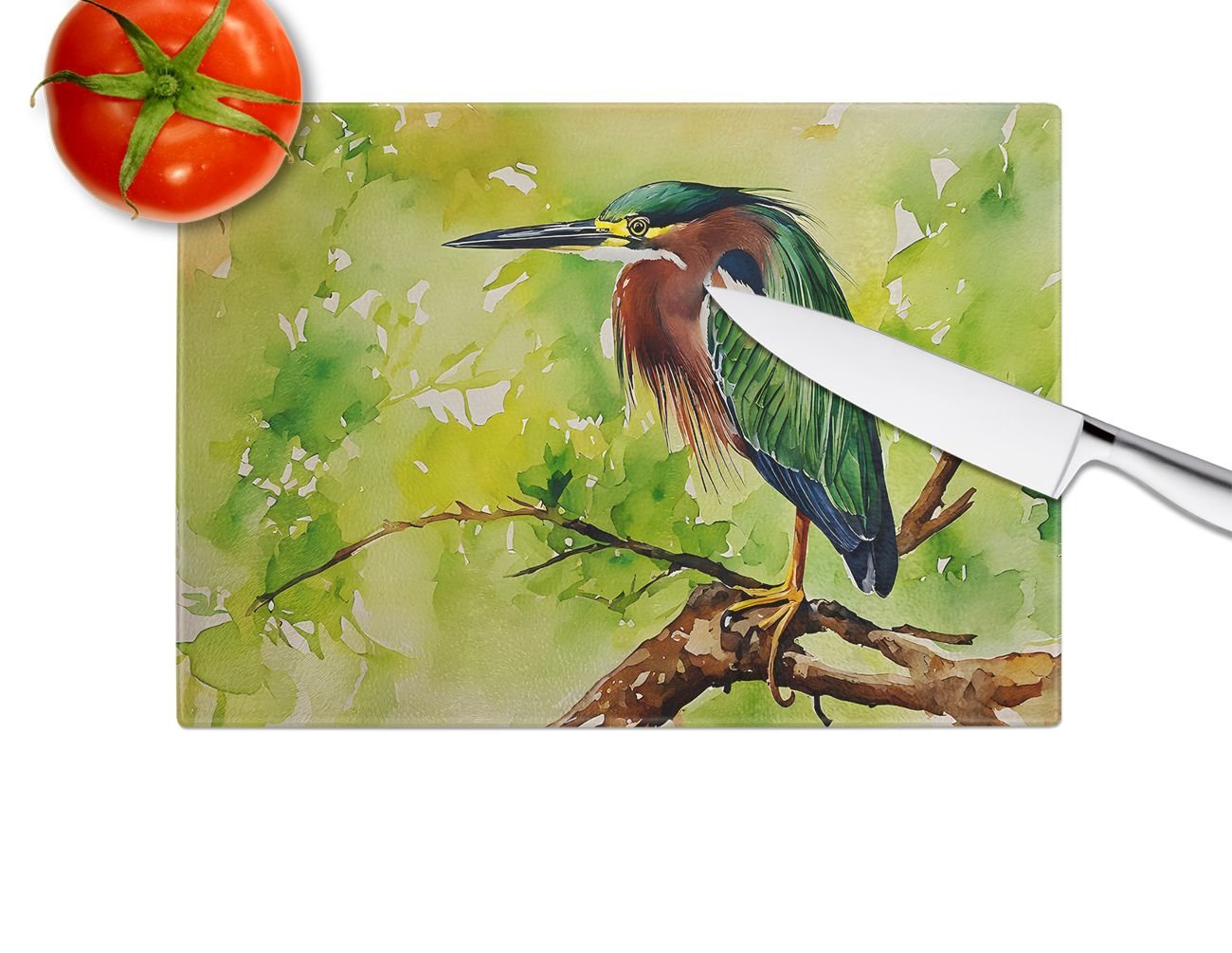 Glass Cutting Board featuring breed specific Green Heron artwork. Introduce your kitchen to the vibrant, large Decorative Glass Cutting Board from Caroline's Treasures. Crafted from resilient tempered glass, this board is not only a utilitarian necessity but also a colorful art piece. With its generous dimensions of 15 inches in height and 12 inches in length, it offers ample space for all your cutting needs. Every piece showcases captivating artwork from distinguished artists, bringing an aesthetic edge to your kitchen. Beyond its attractive design, this cutting board ensures your countertop stays pristine and unscathed, owing to its heat-resistant properties. Engineered with user convenience in mind, it features non-skid feet for stability, and rounded corners for additional safety. Its robust construction renders it virtually unbreakable, guaranteeing longevity. The board comes with protective feet bumpers, maintaining its position during use. This product is recommended to be hand washed only. Proudly printed and assembled in the United States, this cutting board exemplifies superior craftsmanship. With Caroline's Treasures' Decorative Glass Cutting Board, you're investing in a blend of functionality and artistic flair.