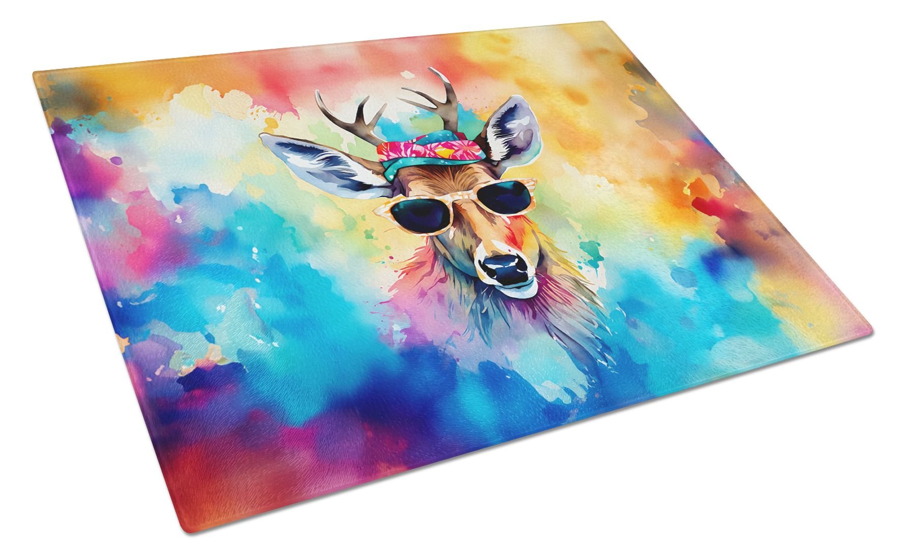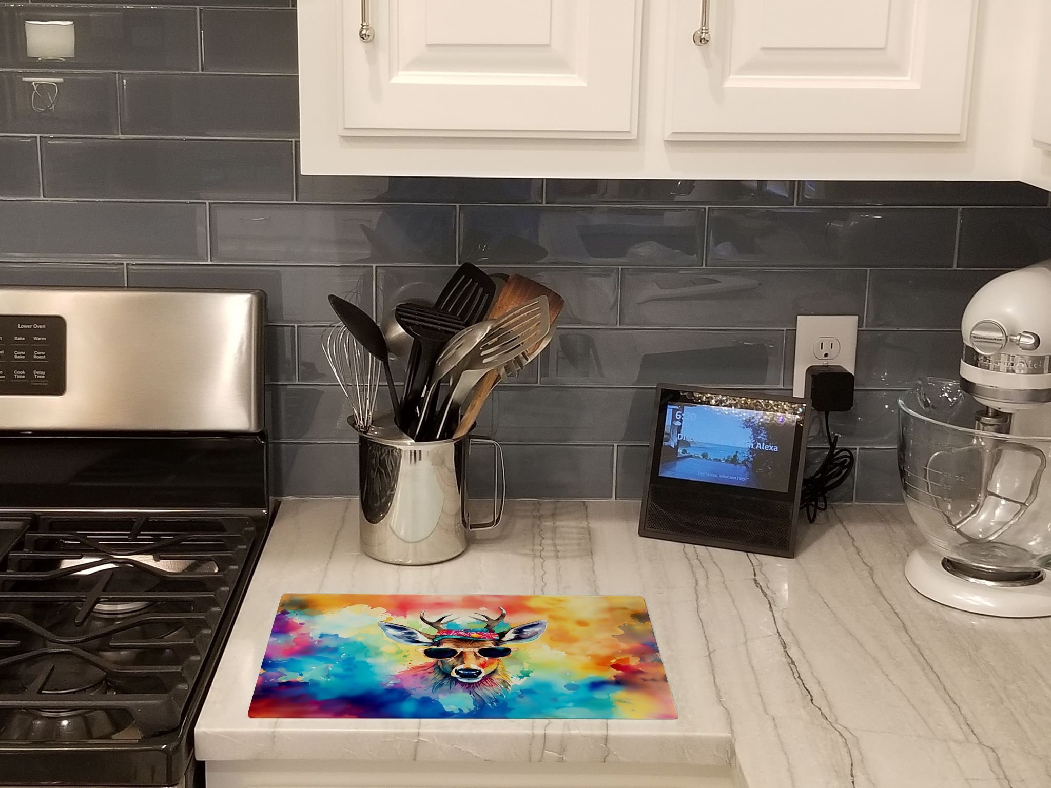 Glass Cutting Board featuring breed specific Deer artwork. Introduce your kitchen to the vibrant, large Decorative Glass Cutting Board from Caroline's Treasures. Crafted from resilient tempered glass, this board is not only a utilitarian necessity but also a colorful art piece. With its generous dimensions of 15 inches in height and 12 inches in length, it offers ample space for all your cutting needs. Every piece showcases captivating artwork from distinguished artists, bringing an aesthetic edge to your kitchen. Beyond its attractive design, this cutting board ensures your countertop stays pristine and unscathed, owing to its heat-resistant properties. Engineered with user convenience in mind, it features non-skid feet for stability, and rounded corners for additional safety. Its robust construction renders it virtually unbreakable, guaranteeing longevity. The board comes with protective feet bumpers, maintaining its position during use. This product is recommended to be hand washed only. Proudly printed and assembled in the United States, this cutting board exemplifies superior craftsmanship. With Caroline's Treasures' Decorative Glass Cutting Board, you're investing in a blend of functionality and artistic flair.