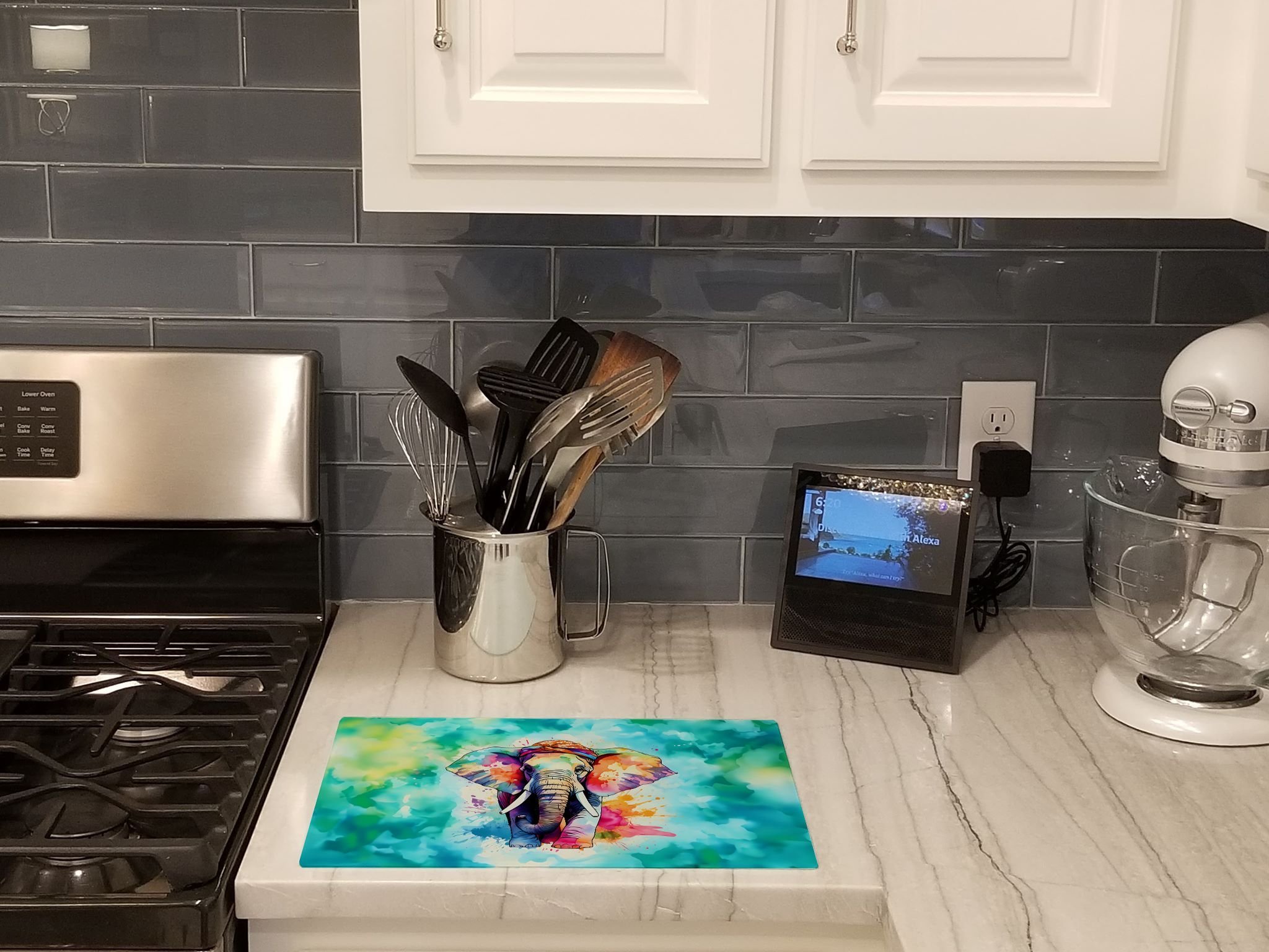 Glass Cutting Board featuring breed specific Elephant artwork. Introduce your kitchen to the vibrant, large Decorative Glass Cutting Board from Caroline's Treasures. Crafted from resilient tempered glass, this board is not only a utilitarian necessity but also a colorful art piece. With its generous dimensions of 15 inches in height and 12 inches in length, it offers ample space for all your cutting needs. Every piece showcases captivating artwork from distinguished artists, bringing an aesthetic edge to your kitchen. Beyond its attractive design, this cutting board ensures your countertop stays pristine and unscathed, owing to its heat-resistant properties. Engineered with user convenience in mind, it features non-skid feet for stability, and rounded corners for additional safety. Its robust construction renders it virtually unbreakable, guaranteeing longevity. The board comes with protective feet bumpers, maintaining its position during use. This product is recommended to be hand washed only. Proudly printed and assembled in the United States, this cutting board exemplifies superior craftsmanship. With Caroline's Treasures' Decorative Glass Cutting Board, you're investing in a blend of functionality and artistic flair.