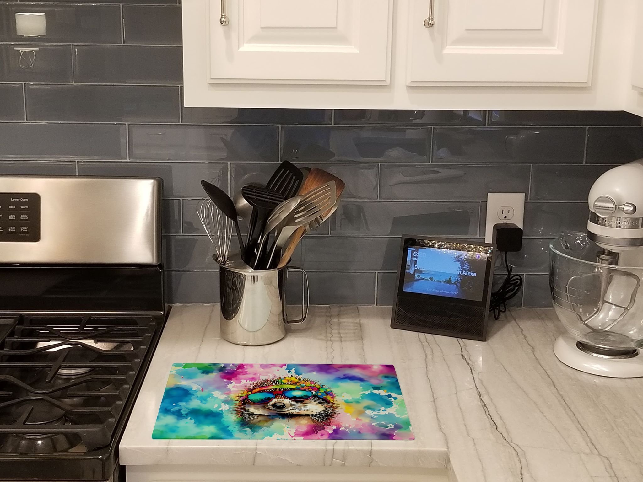 Glass Cutting Board featuring breed specific Hedgehog artwork. Introduce your kitchen to the vibrant, large Decorative Glass Cutting Board from Caroline's Treasures. Crafted from resilient tempered glass, this board is not only a utilitarian necessity but also a colorful art piece. With its generous dimensions of 15 inches in height and 12 inches in length, it offers ample space for all your cutting needs. Every piece showcases captivating artwork from distinguished artists, bringing an aesthetic edge to your kitchen. Beyond its attractive design, this cutting board ensures your countertop stays pristine and unscathed, owing to its heat-resistant properties. Engineered with user convenience in mind, it features non-skid feet for stability, and rounded corners for additional safety. Its robust construction renders it virtually unbreakable, guaranteeing longevity. The board comes with protective feet bumpers, maintaining its position during use. This product is recommended to be hand washed only. Proudly printed and assembled in the United States, this cutting board exemplifies superior craftsmanship. With Caroline's Treasures' Decorative Glass Cutting Board, you're investing in a blend of functionality and artistic flair.