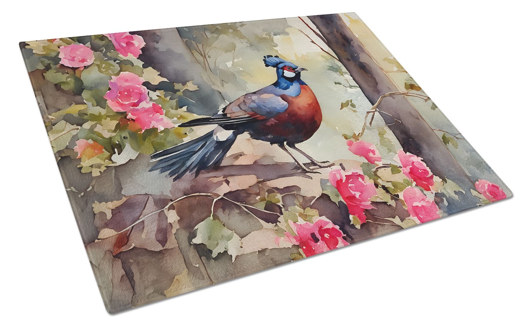 Glass Cutting Board featuring breed specific Pheasant artwork. Introduce your kitchen to the vibrant, large Decorative Glass Cutting Board from Caroline's Treasures. Crafted from resilient tempered glass, this board is not only a utilitarian necessity but also a colorful art piece. With its generous dimensions of 15 inches in height and 12 inches in length, it offers ample space for all your cutting needs. Every piece showcases captivating artwork from distinguished artists, bringing an aesthetic edge to your kitchen. Beyond its attractive design, this cutting board ensures your countertop stays pristine and unscathed, owing to its heat-resistant properties. Engineered with user convenience in mind, it features non-skid feet for stability, and rounded corners for additional safety. Its robust construction renders it virtually unbreakable, guaranteeing longevity. The board comes with protective feet bumpers, maintaining its position during use. This product is recommended to be hand washed only. Proudly printed and assembled in the United States, this cutting board exemplifies superior craftsmanship. With Caroline's Treasures' Decorative Glass Cutting Board, you're investing in a blend of functionality and artistic flair.