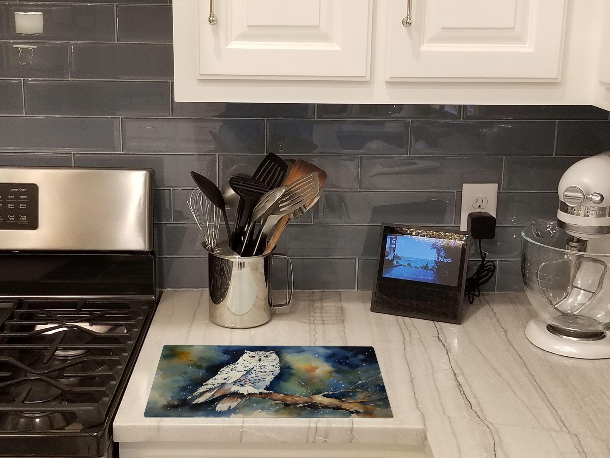 Glass Cutting Board featuring breed specific Snowy Owl artwork. Introduce your kitchen to the vibrant, large Decorative Glass Cutting Board from Caroline's Treasures. Crafted from resilient tempered glass, this board is not only a utilitarian necessity but also a colorful art piece. With its generous dimensions of 15 inches in height and 12 inches in length, it offers ample space for all your cutting needs. Every piece showcases captivating artwork from distinguished artists, bringing an aesthetic edge to your kitchen. Beyond its attractive design, this cutting board ensures your countertop stays pristine and unscathed, owing to its heat-resistant properties. Engineered with user convenience in mind, it features non-skid feet for stability, and rounded corners for additional safety. Its robust construction renders it virtually unbreakable, guaranteeing longevity. The board comes with protective feet bumpers, maintaining its position during use. This product is recommended to be hand washed only. Proudly printed and assembled in the United States, this cutting board exemplifies superior craftsmanship. With Caroline's Treasures' Decorative Glass Cutting Board, you're investing in a blend of functionality and artistic flair.