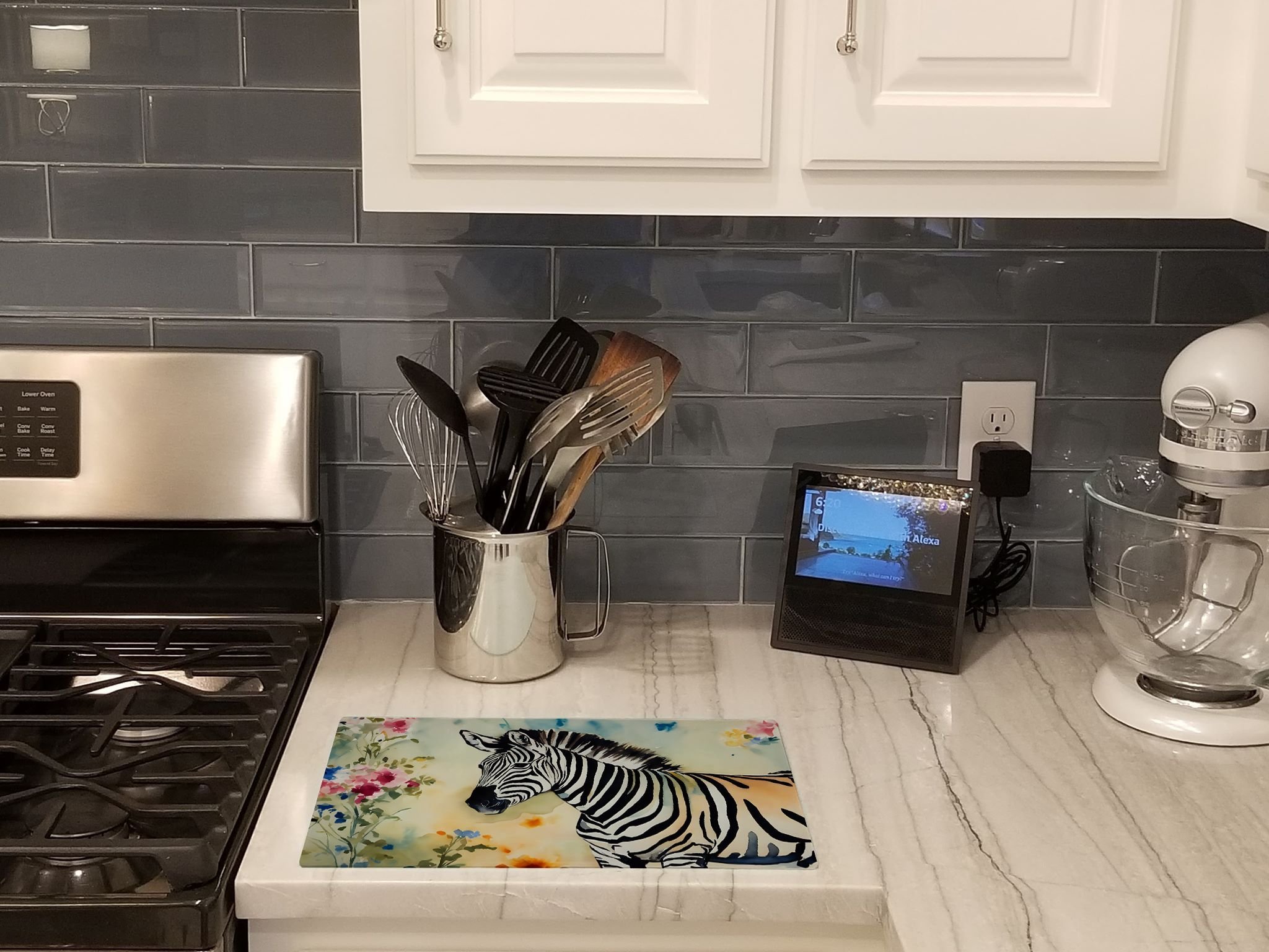 Glass Cutting Board featuring breed specific Zebra artwork. Introduce your kitchen to the vibrant, large Decorative Glass Cutting Board from Caroline's Treasures. Crafted from resilient tempered glass, this board is not only a utilitarian necessity but also a colorful art piece. With its generous dimensions of 15 inches in height and 12 inches in length, it offers ample space for all your cutting needs. Every piece showcases captivating artwork from distinguished artists, bringing an aesthetic edge to your kitchen. Beyond its attractive design, this cutting board ensures your countertop stays pristine and unscathed, owing to its heat-resistant properties. Engineered with user convenience in mind, it features non-skid feet for stability, and rounded corners for additional safety. Its robust construction renders it virtually unbreakable, guaranteeing longevity. The board comes with protective feet bumpers, maintaining its position during use. This product is recommended to be hand washed only. Proudly printed and assembled in the United States, this cutting board exemplifies superior craftsmanship. With Caroline's Treasures' Decorative Glass Cutting Board, you're investing in a blend of functionality and artistic flair.