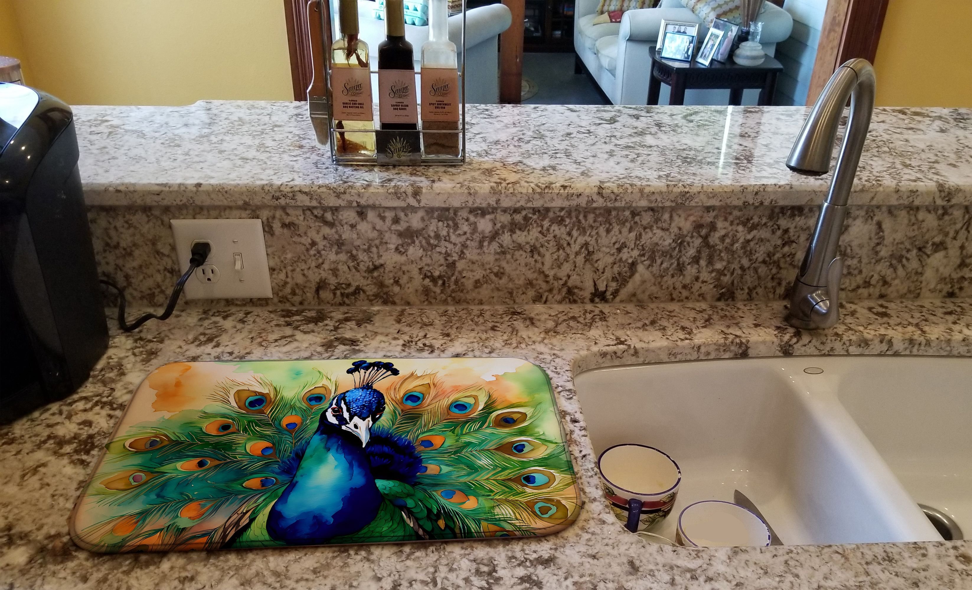 Dish Drying Mat featuring breed specific Peacock artwork. Say goodbye to messy countertops and soggy dish towels with our innovative dish drying mat. Our high-quality dish drying pad is designed to keep your countertops dry while offering a stylish and efficient solution. Whether you're air drying dishes, glasses, stemware, silverware, pots, pans, bottles, or even fruits and vegetables, our dish mat is the perfect choice. The 14 inches x 22 inches size fits most counters and dish drying racks, and the non-slip design ensures stability. Made with water-absorbent polyester and a polyurethane foam insert, our dish drying mat is not only functional but also durable. It's machine washable and printed in the USA for long-lasting use. The beautiful artwork adds flair to your kitchen decor, making it a perfect housewarming gift or present for any occasion. Upgrade your kitchen experience with our absorbent and versatile dish drying mat.