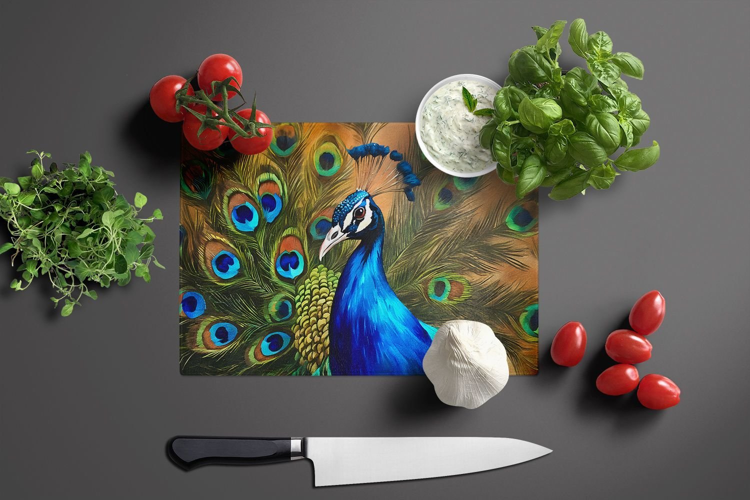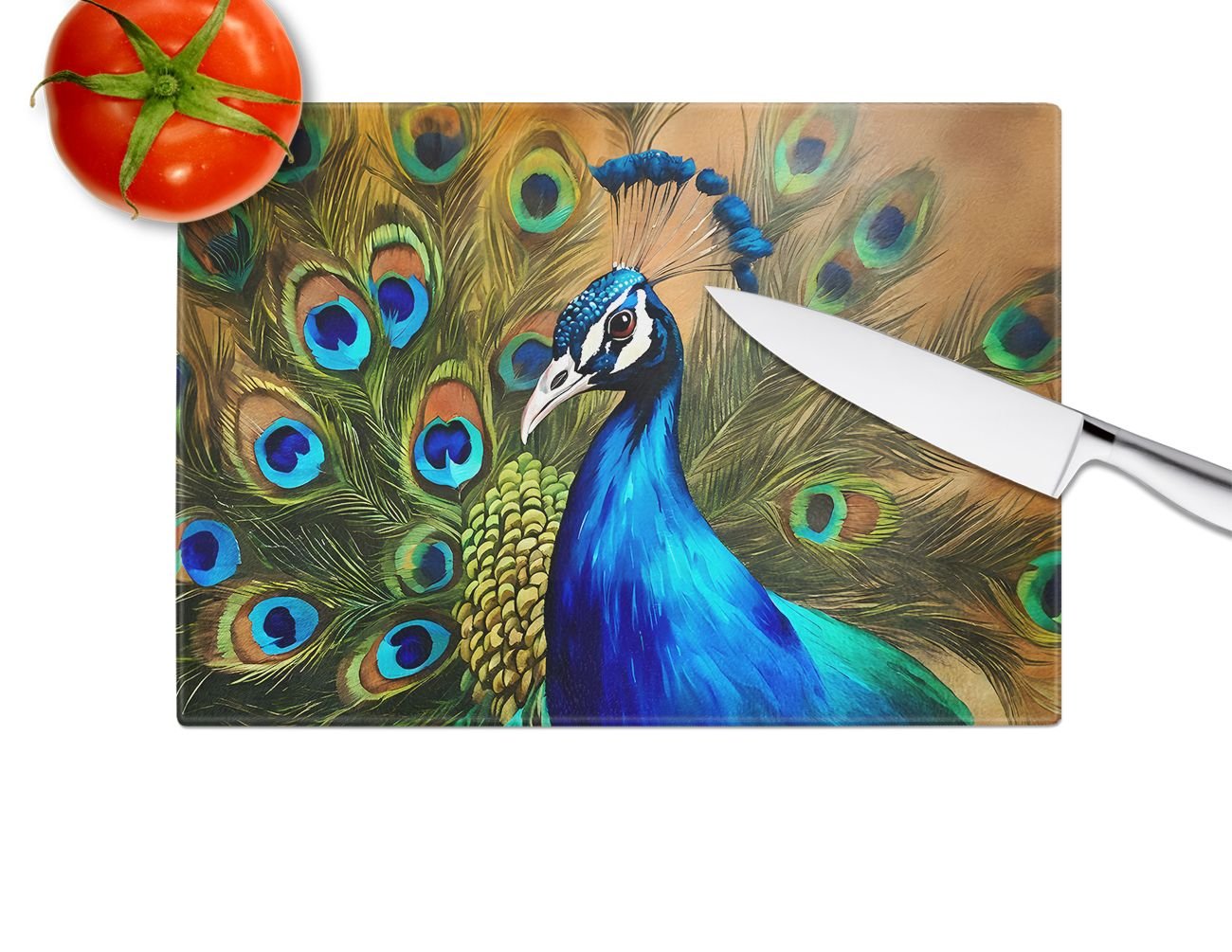Glass Cutting Board featuring breed specific Peacock artwork. Introduce your kitchen to the vibrant, large Decorative Glass Cutting Board from Caroline's Treasures. Crafted from resilient tempered glass, this board is not only a utilitarian necessity but also a colorful art piece. With its generous dimensions of 15 inches in height and 12 inches in length, it offers ample space for all your cutting needs. Every piece showcases captivating artwork from distinguished artists, bringing an aesthetic edge to your kitchen. Beyond its attractive design, this cutting board ensures your countertop stays pristine and unscathed, owing to its heat-resistant properties. Engineered with user convenience in mind, it features non-skid feet for stability, and rounded corners for additional safety. Its robust construction renders it virtually unbreakable, guaranteeing longevity. The board comes with protective feet bumpers, maintaining its position during use. This product is recommended to be hand washed only. Proudly printed and assembled in the United States, this cutting board exemplifies superior craftsmanship. With Caroline's Treasures' Decorative Glass Cutting Board, you're investing in a blend of functionality and artistic flair.