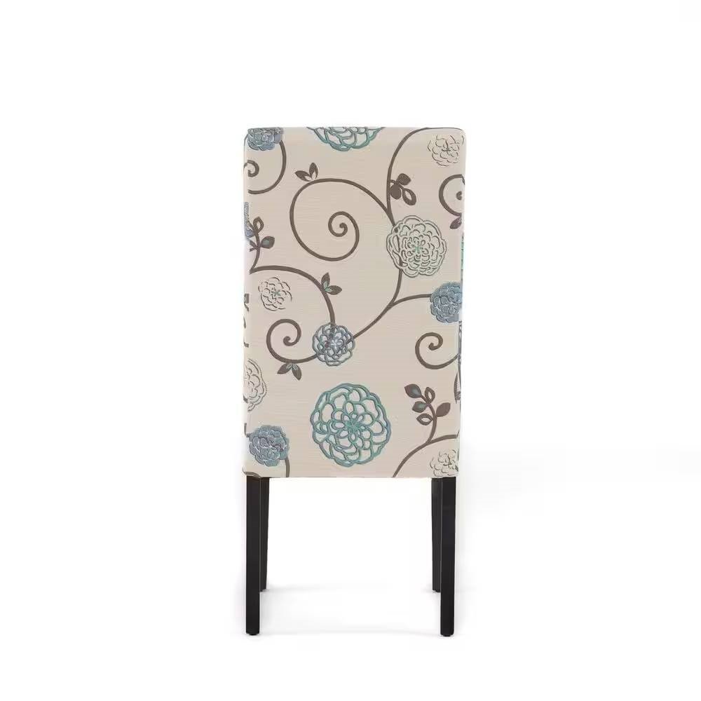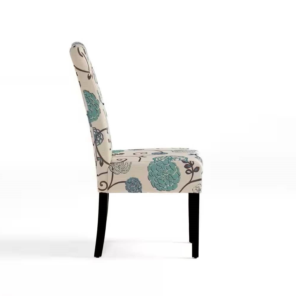 Set of 2 Beige Cream Teal Blue Floral Fabric Dining Chair with Wood Legs