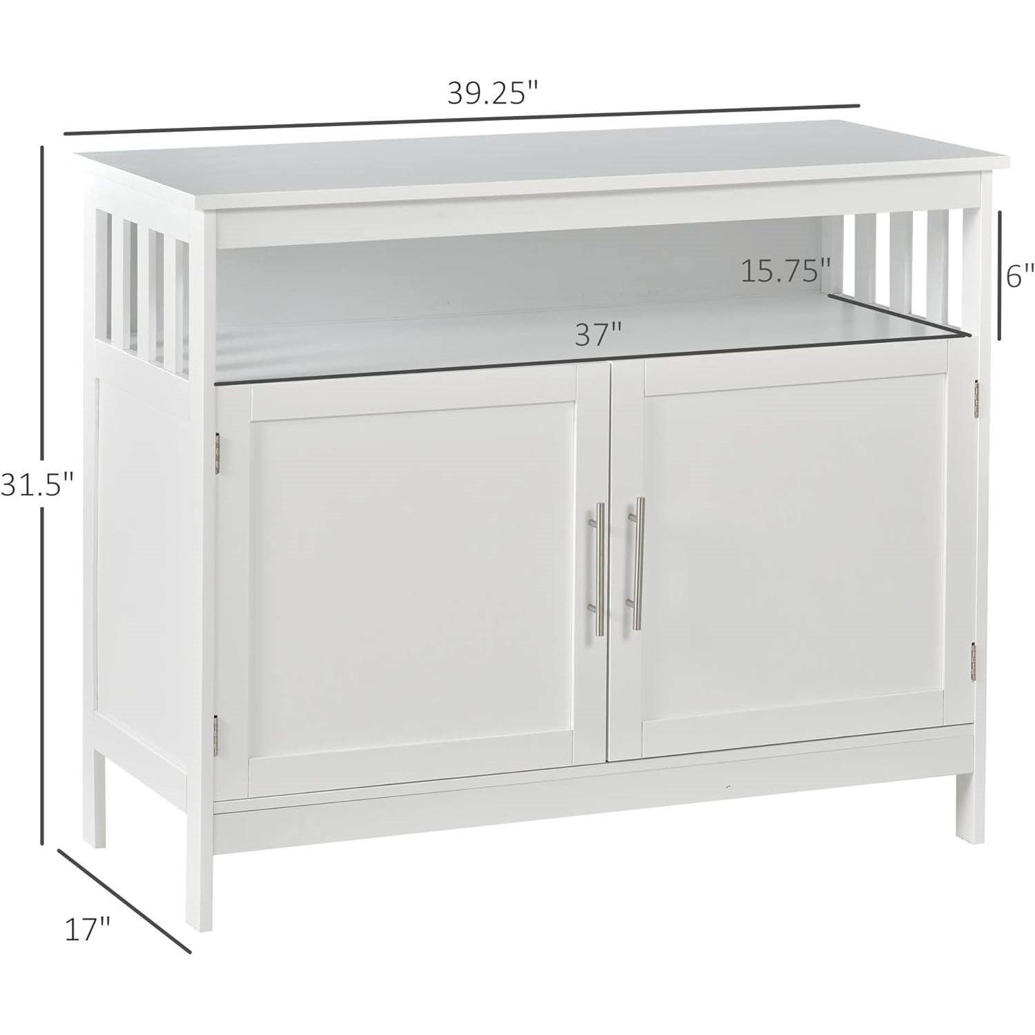 This Modern Dining Storage Cabinet Buffet Sideboard Accent Table in White Wood Finish has a simple while elegant design with aluminum handles that makes it look more lovely. This buffet table is more convenient to use thanks to the magnet door. This Modern Dining Storage Cabinet Buffet Sideboard Accent Table in White Wood Finish has ample space to enlarge your storage space and give you a clean and neat room. An open shelf to hold baskets of essentials or display items, and 1 adjustable shelf inside the decorative cabinet to fit objects of different sizes. Our buffet table with storage is carefully crafted from MDF board with treated surface, so it is good for daily use and is easy to clean up. This Modern Dining Storage Cabinet Buffet Sideboard Accent Table in White Wood Finish is helpful to keep your room in order and add beauty to your home. It can be used not only as a console cabinet in your hallway, but also as a sideboard storage cabinet in the dining room or a coffee bar station for the living room. Overall Dimension: 39.25" L x 17" W x 31.5" H, Weight Capacity: 132lbs (total), 22lbs (countertop), 22lbs (open shelf), 22lbs (the shelf in the cabinet).