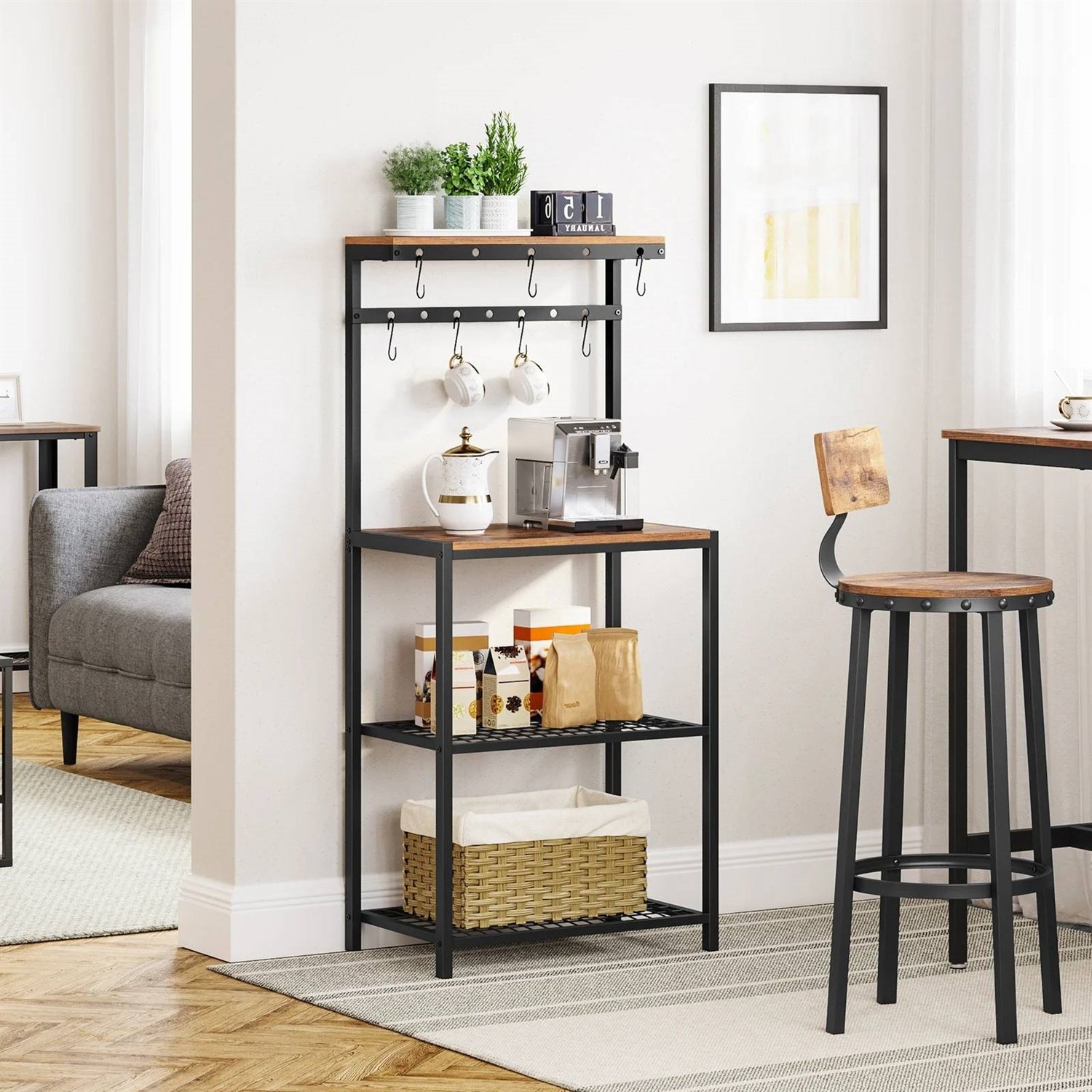 Turn to This Modern Industrial Metal Wood Bakers Rack with Microwave Shelf...for extra counter space in the kitchen, an empty corner in the dining room, or any home lacking a coffee bar. Standing at 23.6"L x 15.7"W x 59.6"H, it offers oodles of storage without overwhelming your space. Its Big Capacity Comes From...4 storage shelves and 12 S hooks. Your cereal bottles go on the top, microwave on the large surface, and boxes on the 2 mesh shelves...what’s even better is that the 12 hooks keep mugs and pans at your fingertips. Its Stability Comes From...strong 0.8" x 0.8" steel tubes and quality particleboard for the firm structure of this kitchen shelf, as well as adjustable feet on the bottom that help keep everything in place, even on uneven floors. Its Timeless Flavor Comes From..the rustic romance pairing with steel toughness. Spice up your kitchen with this metal baker’s rack that brings a relaxing industrial vibe into life.