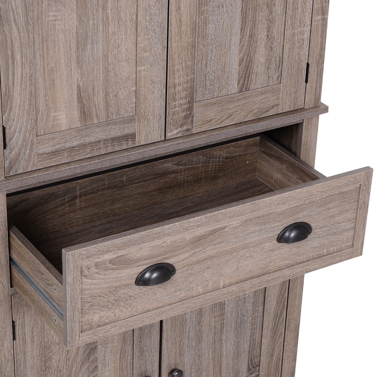 This elegant FarmHome 6ft Kitchen / Bathroom Storage Pantry Drawer Cabinet Wood Grain becomes a functional centerpiece in any room, adding charm along with ample storage and display space. The kitchen pantry features a single center drawer with both the upper and lower doors opening to 1 fixed and 2 fully adjustable shelves, which allows for flexible storage space that fits your individual needs. The kitchen pantry features a single center drawer with both the upper and lower doors opening to 1 fixed and 2 fully adjustable shelves, which allows for flexible storage space that fits your individual needs. Constructed from engineered wood with a reinforced backboard and wall attachments for added stability and safety. he vertical kitchen cabinet takes up little floor space that measures 30 inches W x 16 inches D x 72.5 inches H, with an overall 220lbs weight capacity.