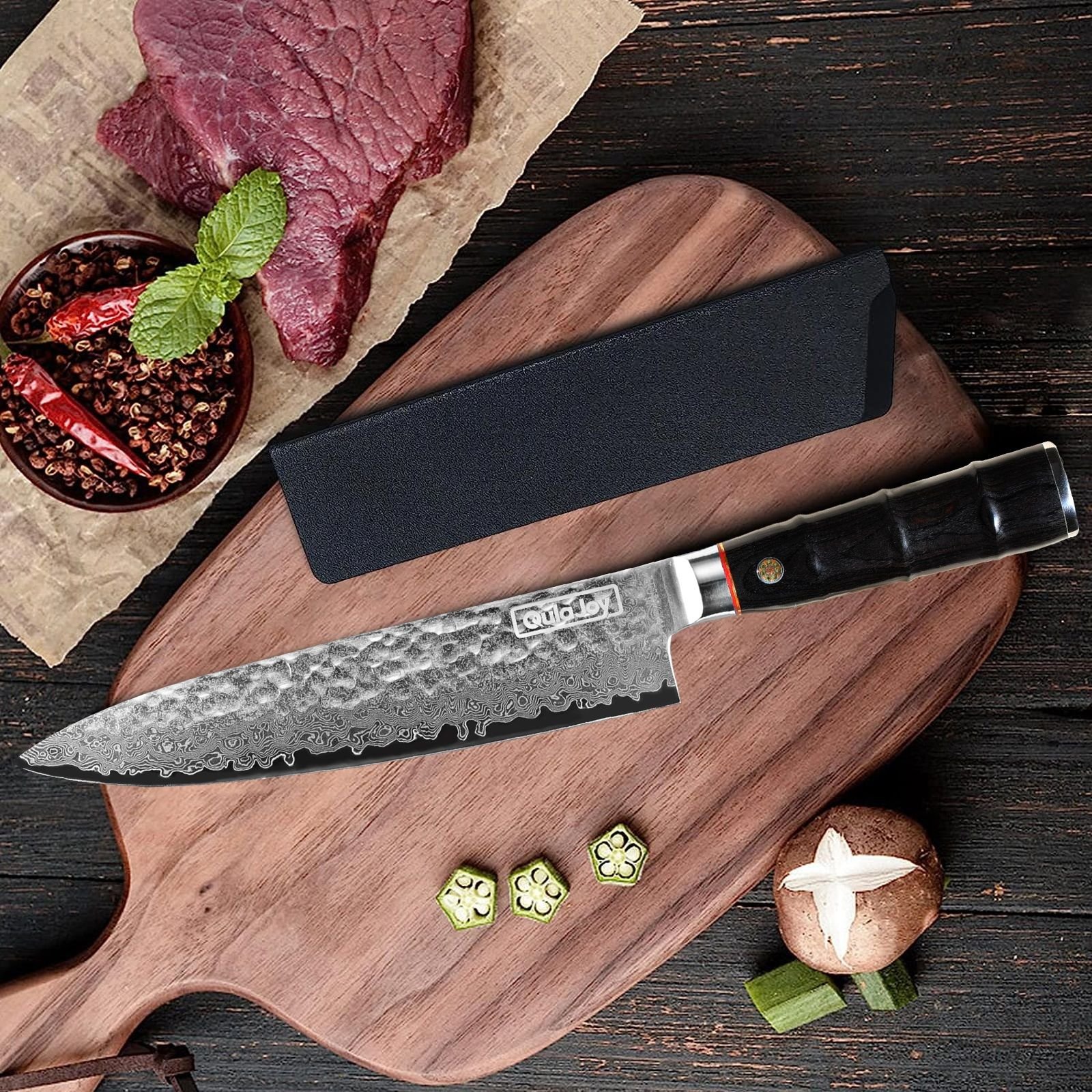 • SHARP CHEF KNIFE:Qulajoy chef knife is made of Japanese VG-10 steel core and forged from 67 layers damascus. HRC60±2, with excellent resistance to corrosion and rust, as well as incredible edge retention. Hand polished by our expert craftsmen for clean, flat, precise cutting edges. Also known as the master chef's knife, it can dice, chop, slice and carve with ease.