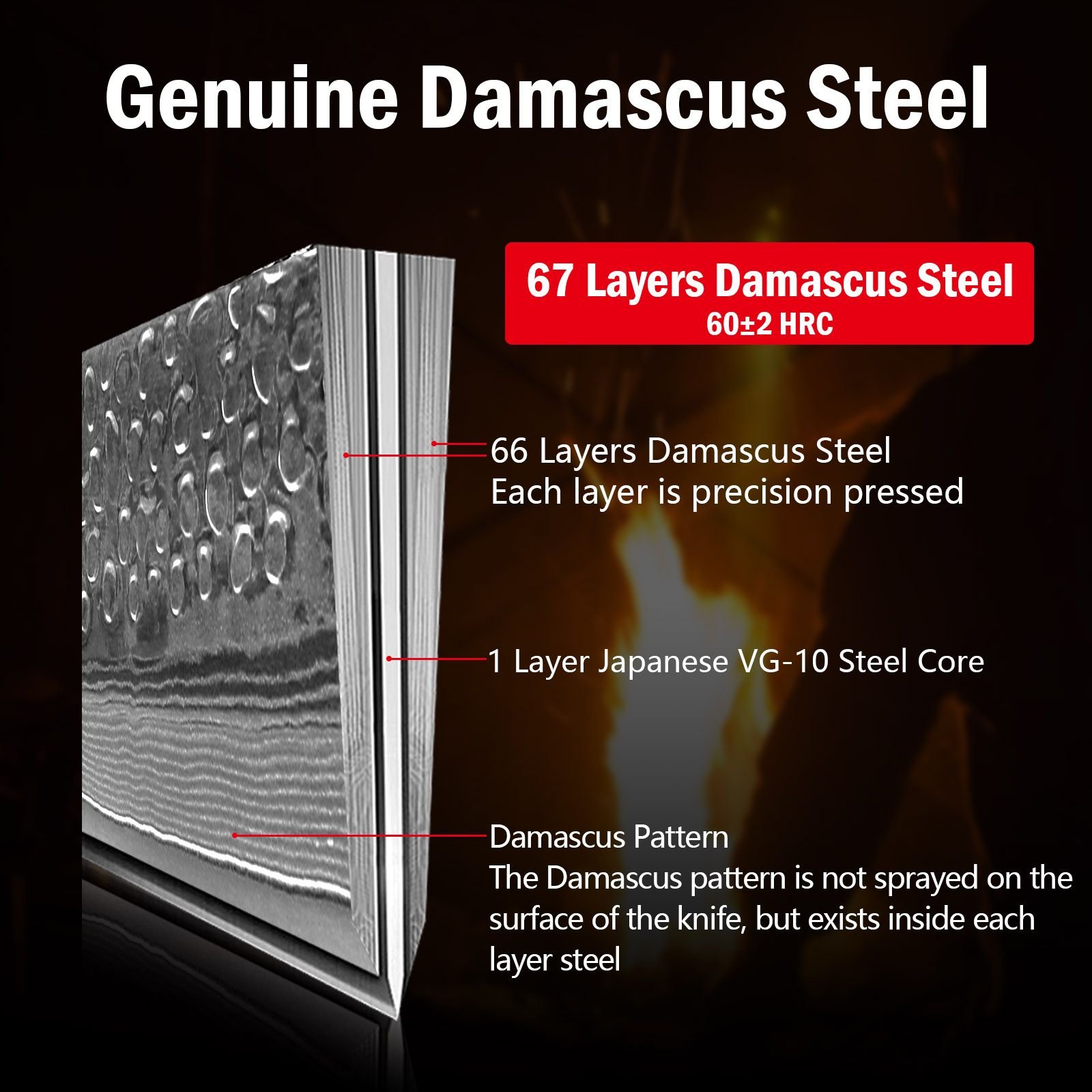 • ✔️ULTRA SHARP BLADE:This professional chef's knife is made from 67 layers of Damascus steel with a VG-10 steel core. The blade has been processed by vacuum high temperature and cryogenic processes, and the blade edge has excellent edge retention and is rust-resistant and corrosion-resistant. 66-layer high-carbon stainless steel Damascus steel cladding adds to the aesthetic appeal. HRC 60±2, the edges are not easy to chip or crack.