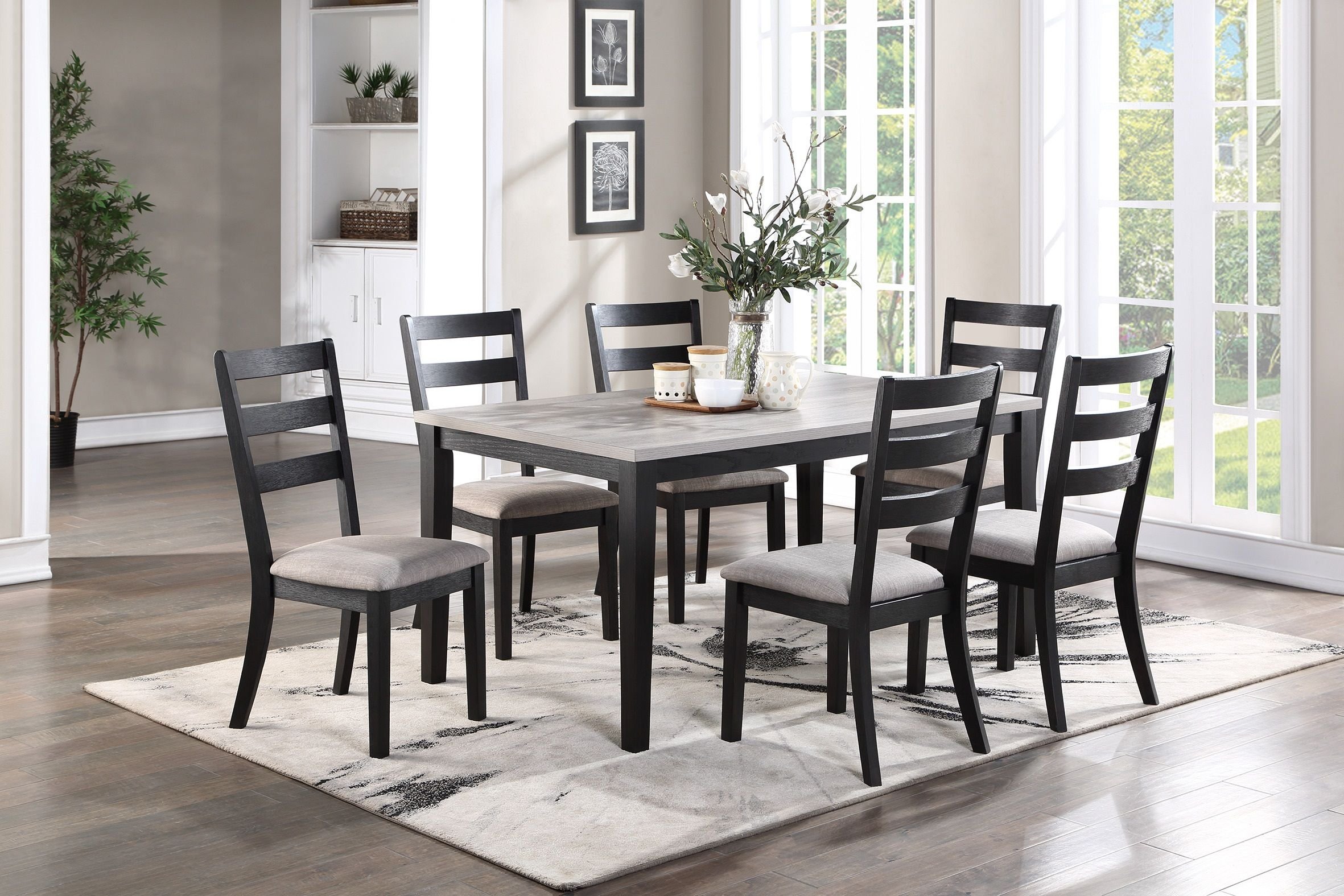 Rustic Charcoal Wooden Table 7pc Dining Set Dining Room Furniture Ladder back Side Chairs Cushion Seat light 2-Tone Sand Fabric.