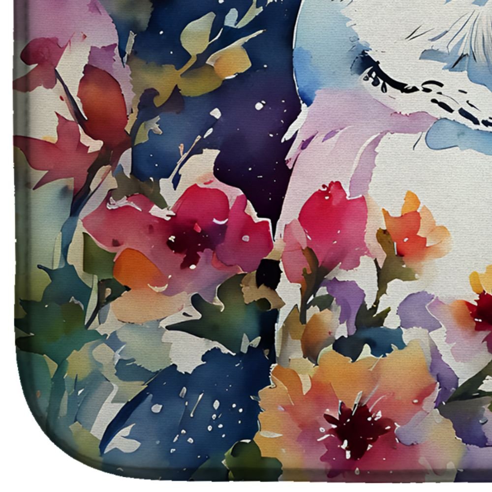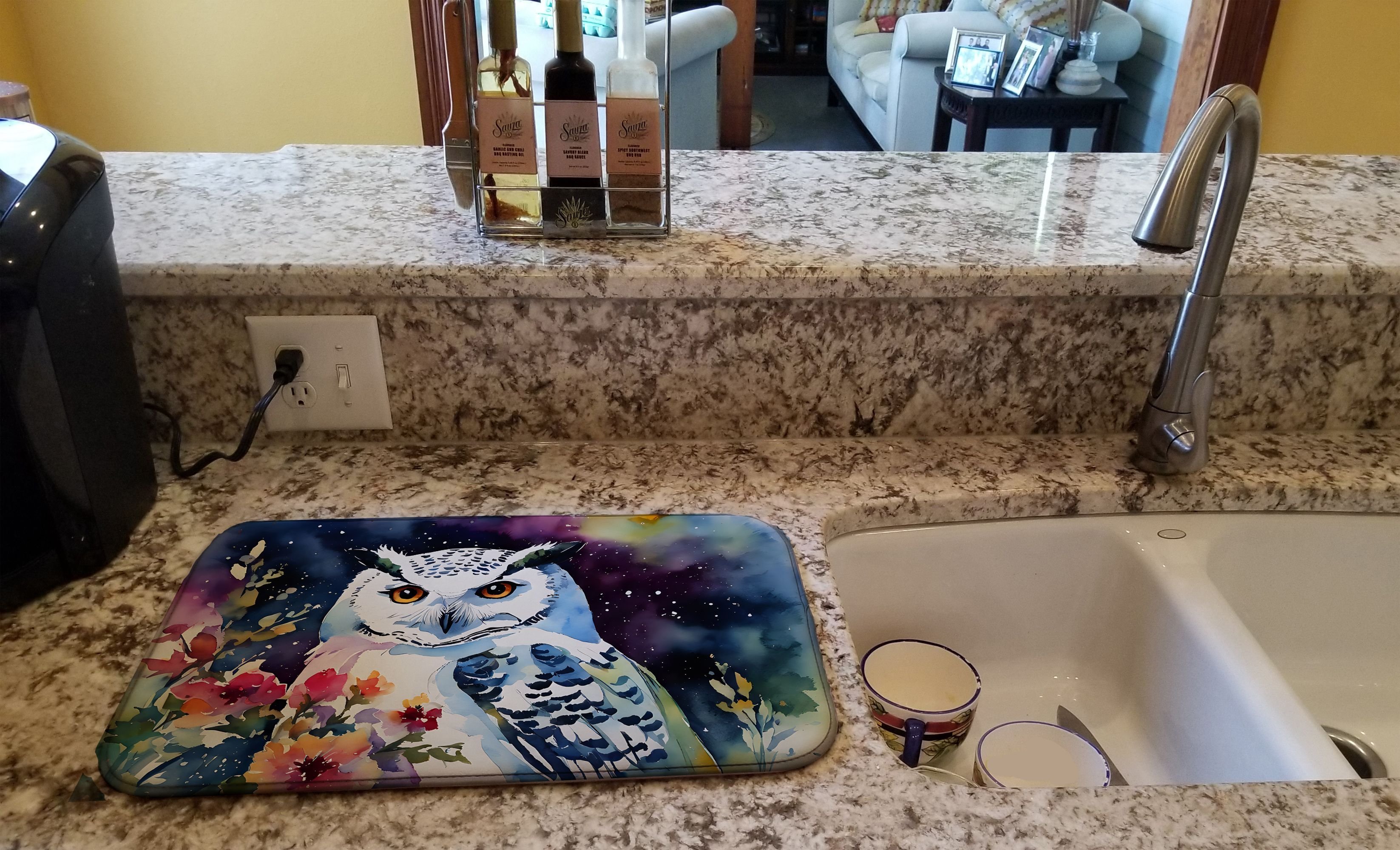 Dish Drying Mat featuring breed specific Snowy Owl artwork. Say goodbye to messy countertops and soggy dish towels with our innovative dish drying mat. Our high-quality dish drying pad is designed to keep your countertops dry while offering a stylish and efficient solution. Whether you're air drying dishes, glasses, stemware, silverware, pots, pans, bottles, or even fruits and vegetables, our dish mat is the perfect choice. The 14 inches x 22 inches size fits most counters and dish drying racks, and the non-slip design ensures stability. Made with water-absorbent polyester and a polyurethane foam insert, our dish drying mat is not only functional but also durable. It's machine washable and printed in the USA for long-lasting use. The beautiful artwork adds flair to your kitchen decor, making it a perfect housewarming gift or present for any occasion. Upgrade your kitchen experience with our absorbent and versatile dish drying mat.
