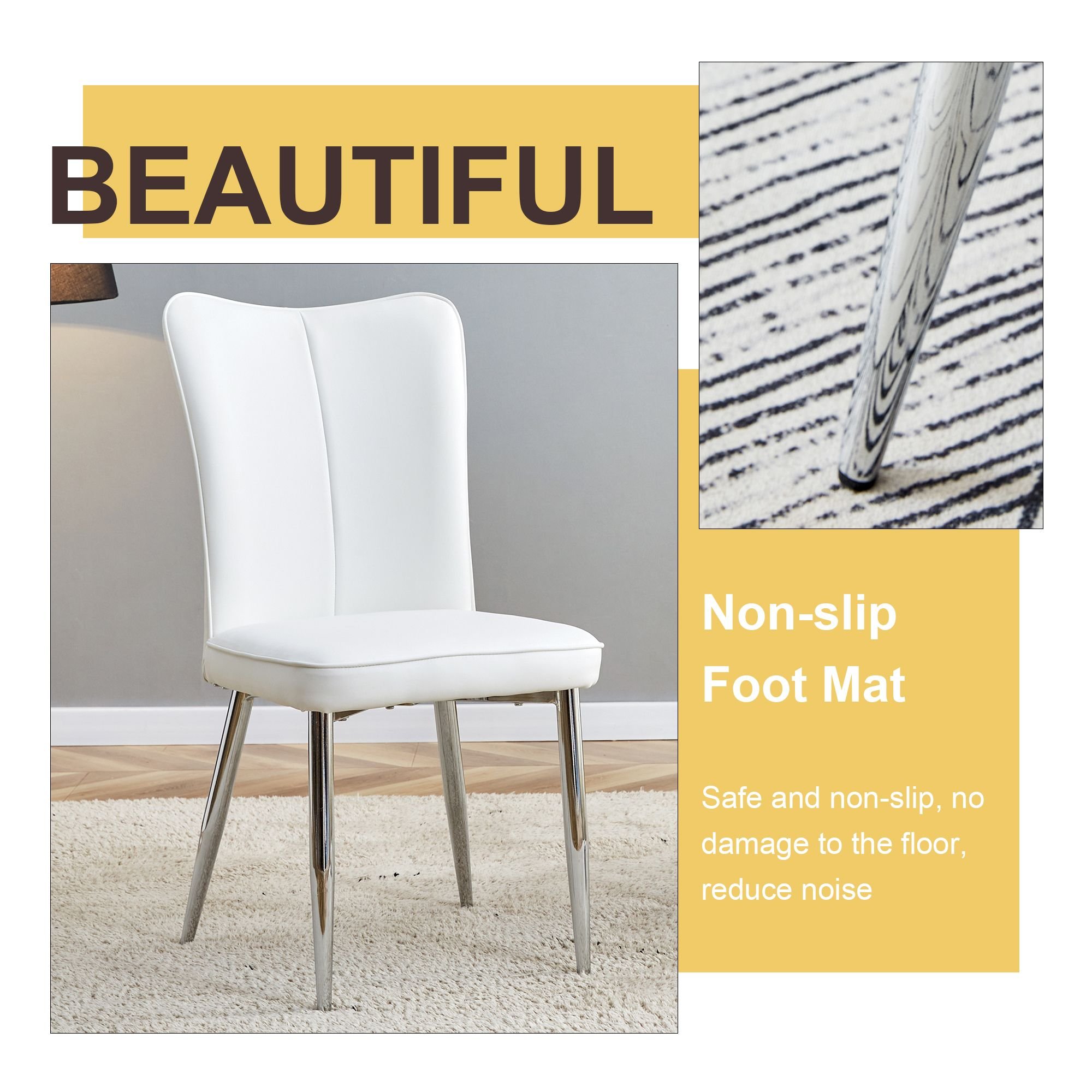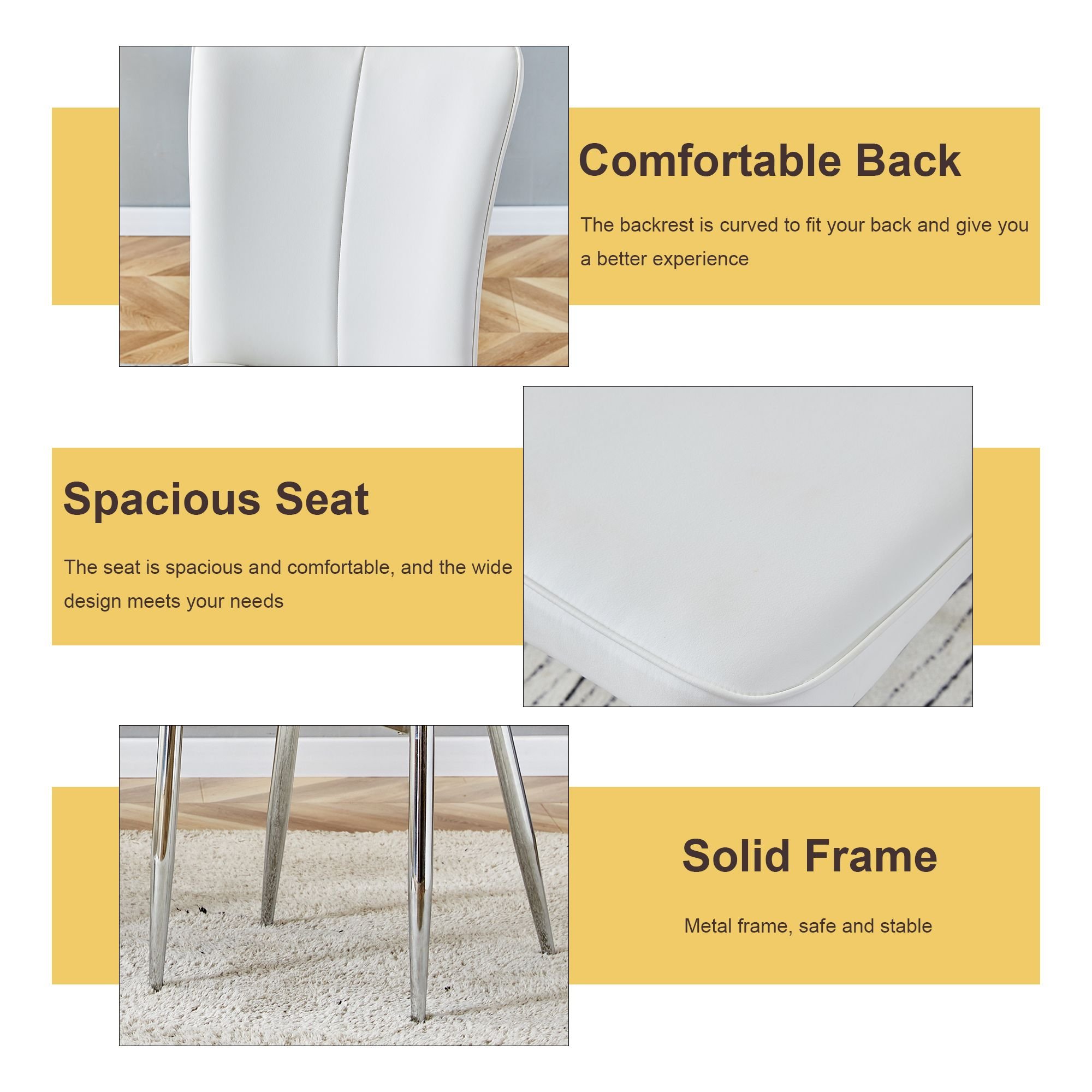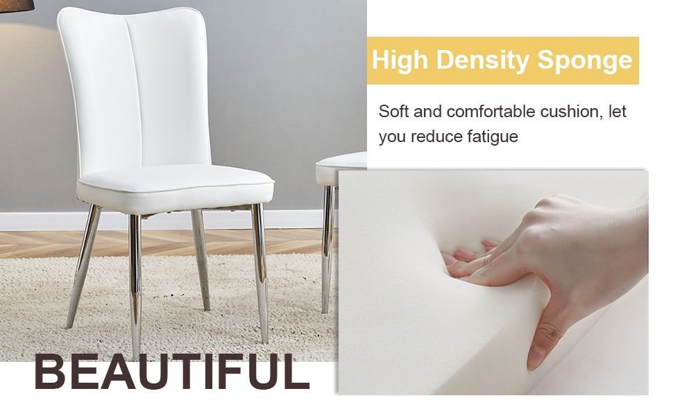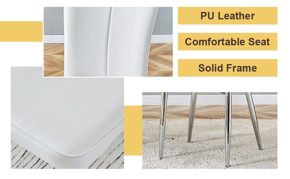 White PU Chairs: The white PU material chairs are soft and comfortable, providing a good sitting experience.Simple Vertical Line Backrest: The chair backrest is designed simply with vertical lines, adding a modern touch and conforming to ergonomics.
