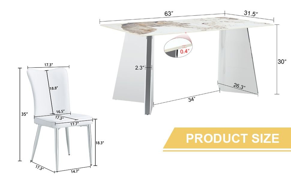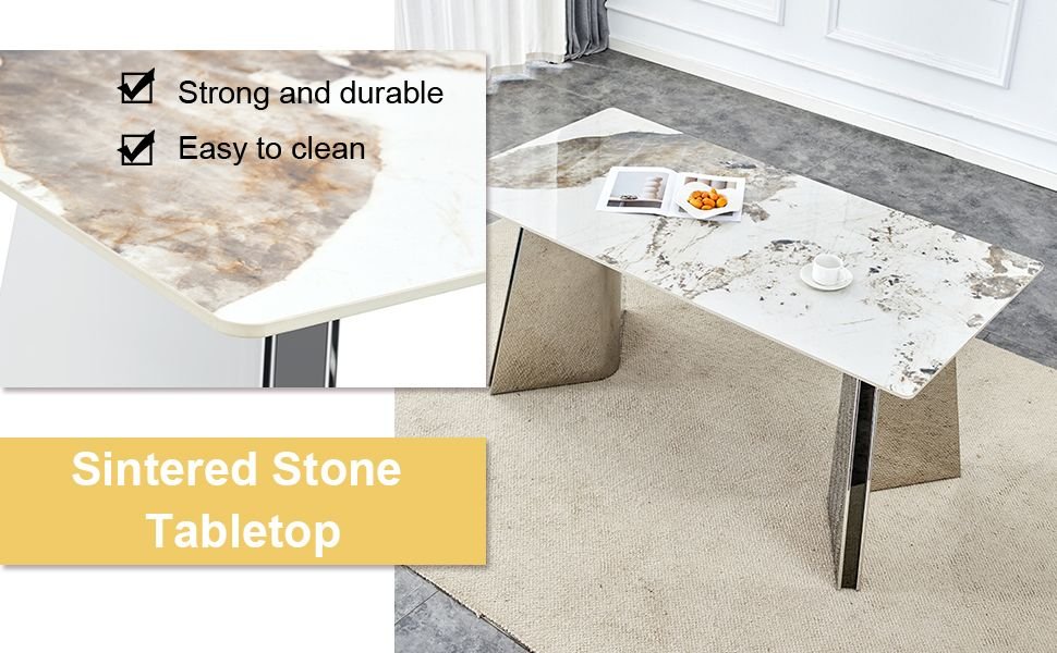 Premium Sintered Stone Table Top: Made of durable slab material with a Pandora patterned , bringing a high-end texture to your dining area.Scratch and Heat Resistant: The tabletop is designed to be scratch and heat resistant, suitable for placing hot dishes, and easy for daily maintenance.Smooth Edges: The edges of the dining table are finely polished, smooth to the touch, providing a comfortable user experience.