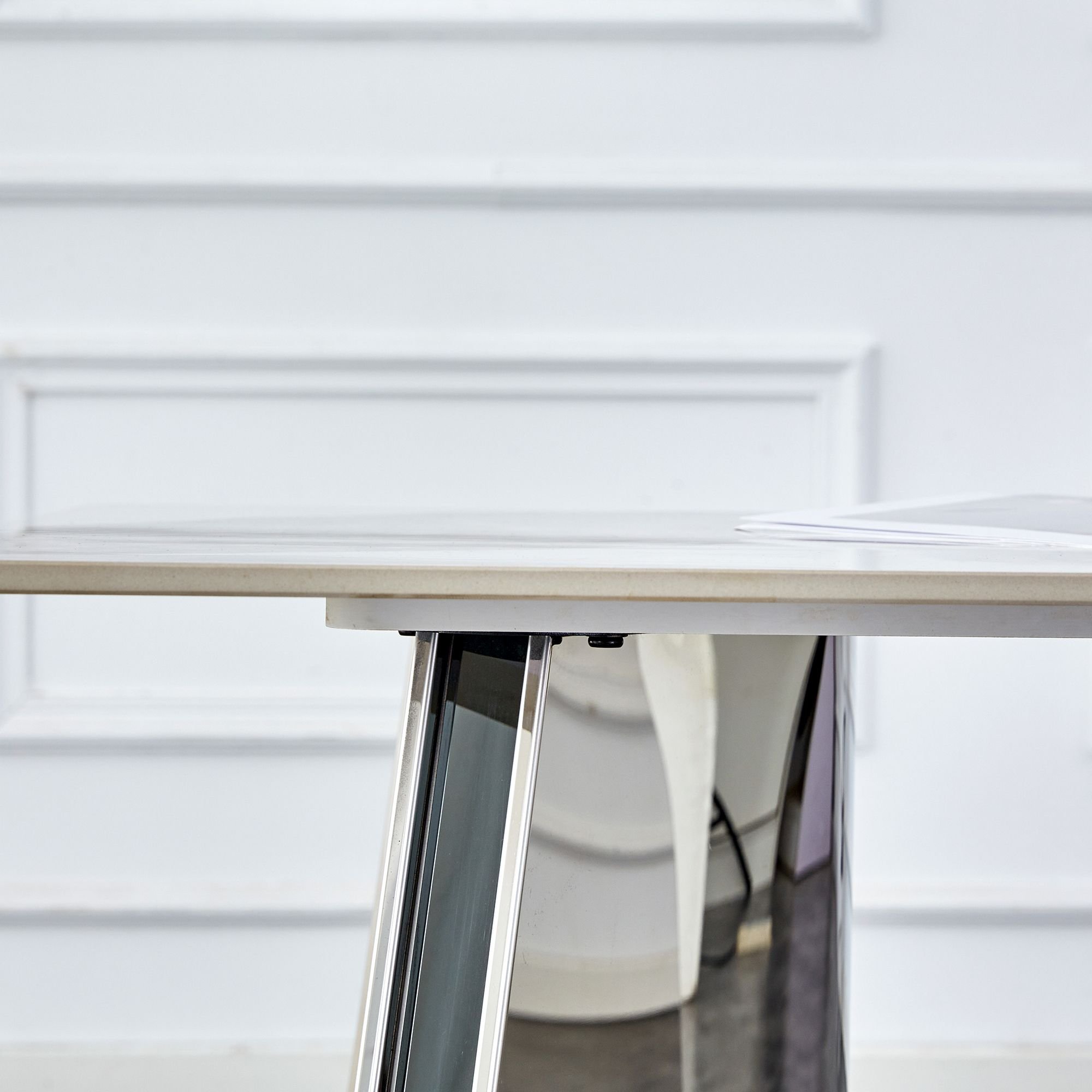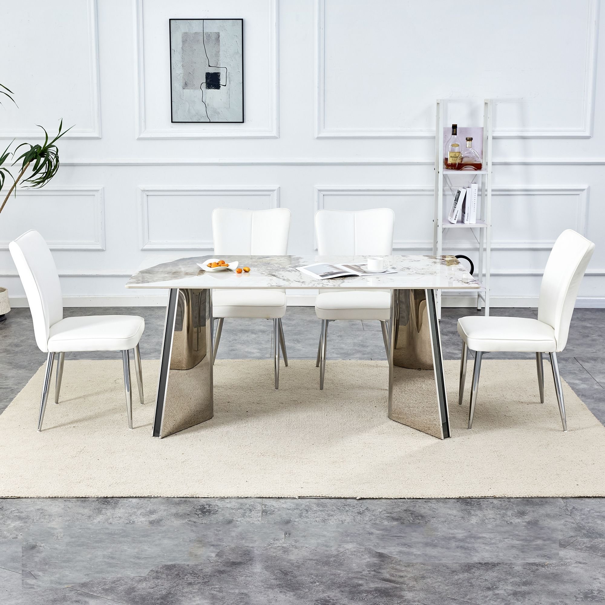 Create a minimalist, artistic dining space with first-class panels and craftsmanship. It makes the whole dining room space full of high-class feeling. Symmetrical design table legs are more stable. The silver luster is even show the noble atmosphere. It allows you to enjoy the food at the same time, but also feel the charm of quality home.