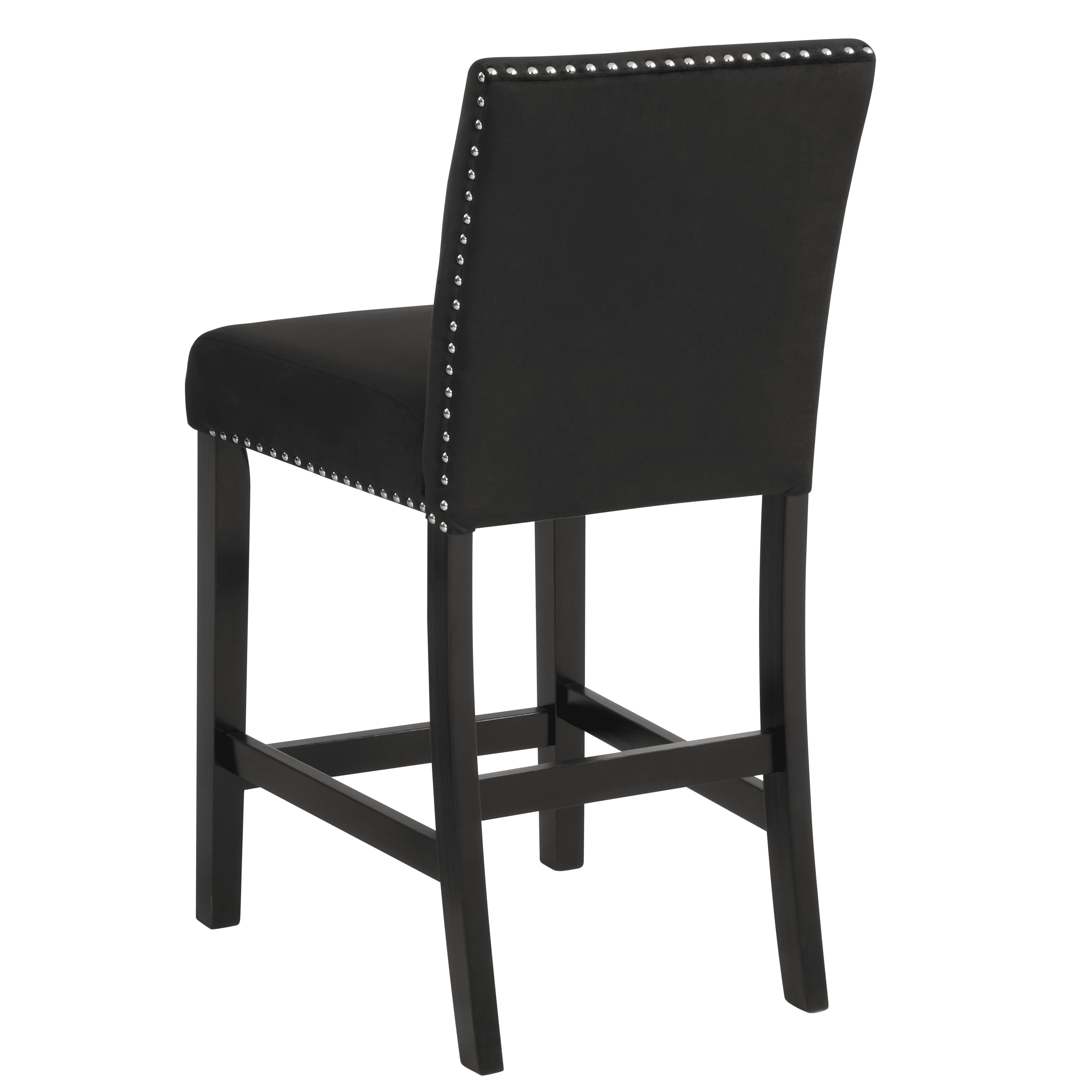 This collection features a counter-height dining table with a wooden frame, a faux marble tabletop, and a black finish. The counter height dining stools feature an upholstered back and seat, tapered legs with footrest, and are adorned with nailhead accents. This set includes a dining table and four counter-height chairs.