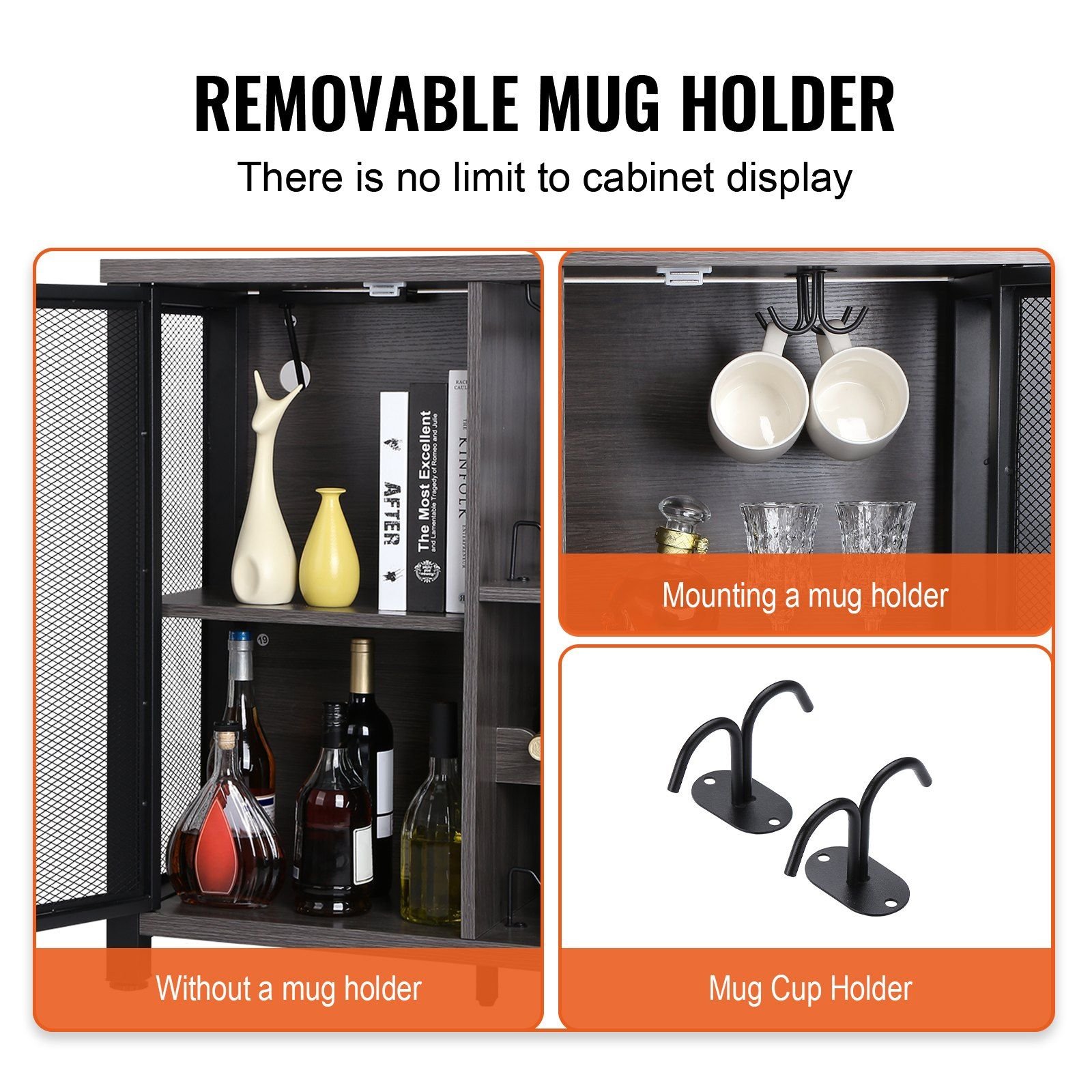 4.Adjustable Shelves: The bar cabinet board has predrilled holes to achieve 3 heights. Perfect fit the various sizes of bottles. Adjust height at each gear: 1.3 in / 32 mm.