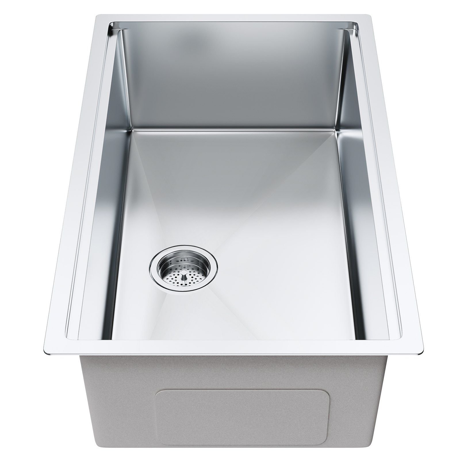 2.Sink Dimensions: Exterior Dimensions: 32" x 19". Internal Dimensions: 30" x 17". Bowl Depth: 9". This stainless steel drop-in sink is quite deep and not only fits those big pots/pans/cookie sheets, it hides the dirty dishes waiting to go into the dishwasher from view.