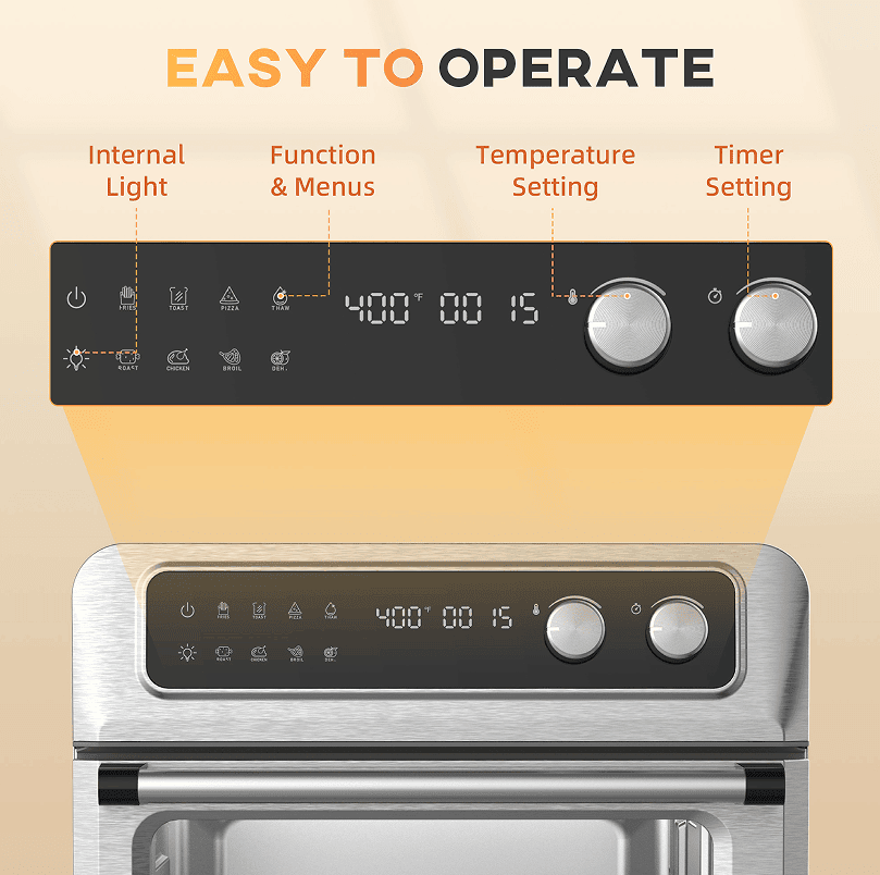 ADJUSTABLE TEMPERATURE & TIMER: You can easily control the temperature of the airfryer oven from 90-450 °F and cooking time from 0-24 h.